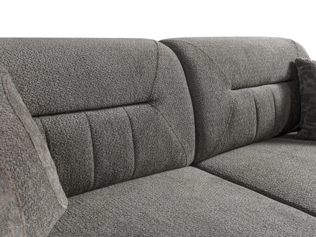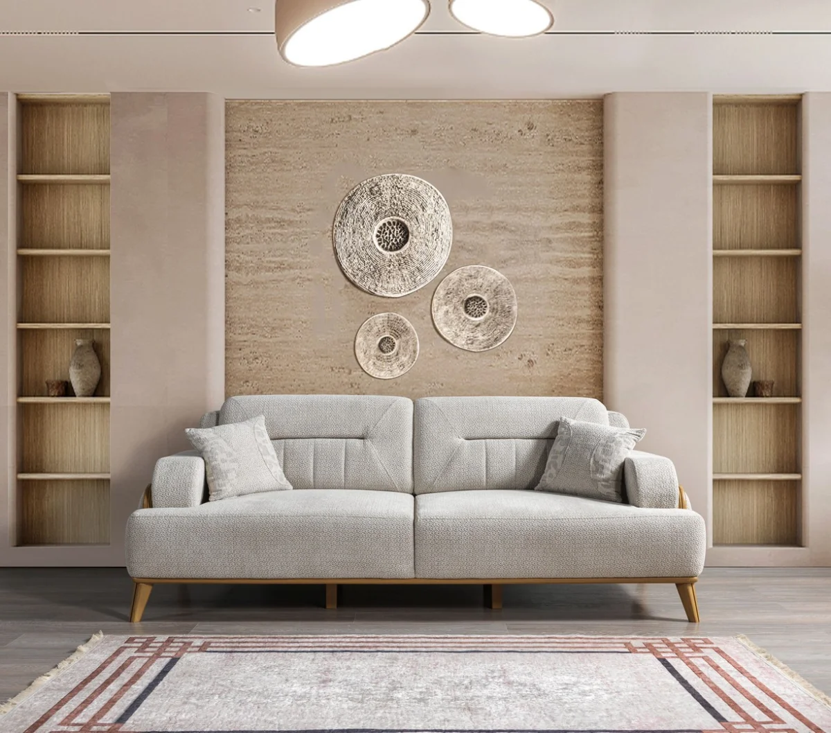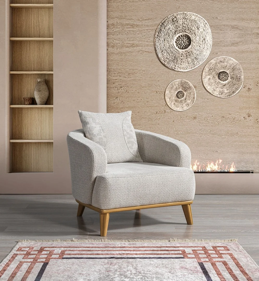 Aspendos Koltuk Takımı, gri kumaş kaplama ve ahşap ayak detaylarıyla zamansız şıklık sunar. Rahat oturma deneyimi için ideal tasarım.