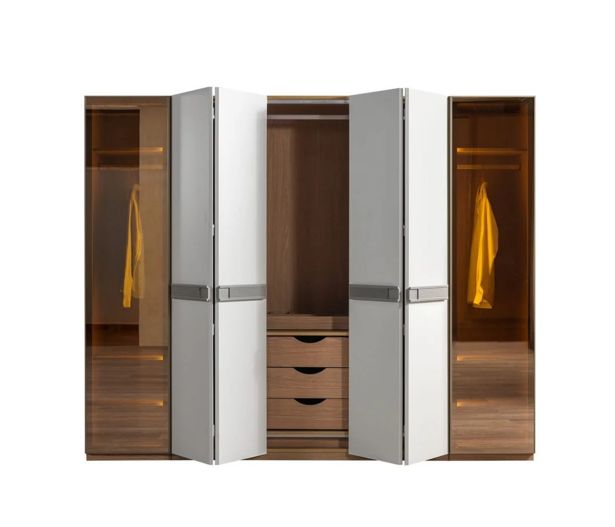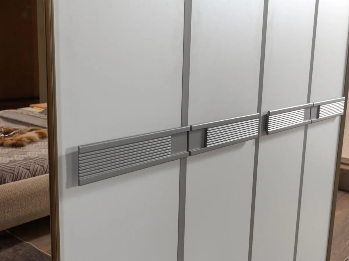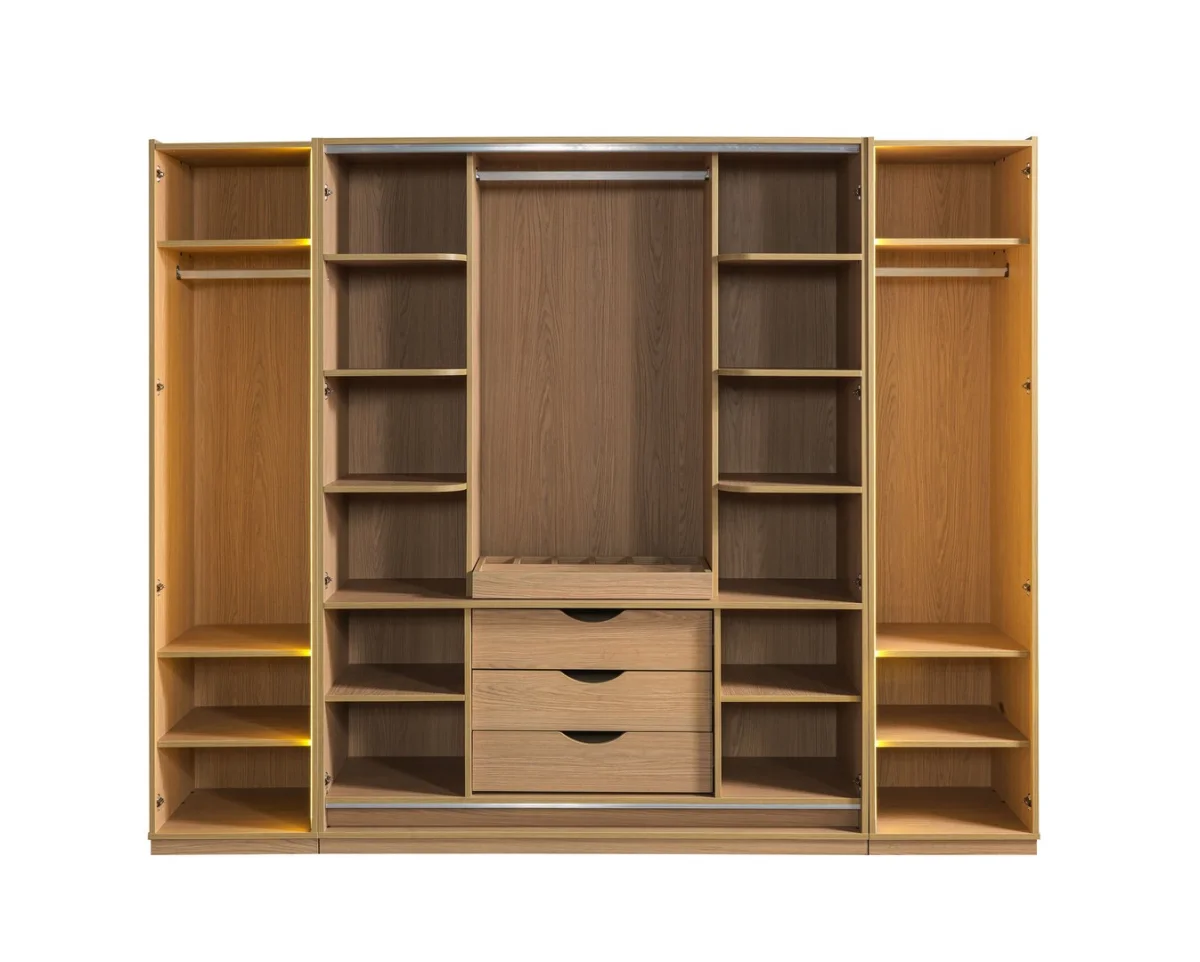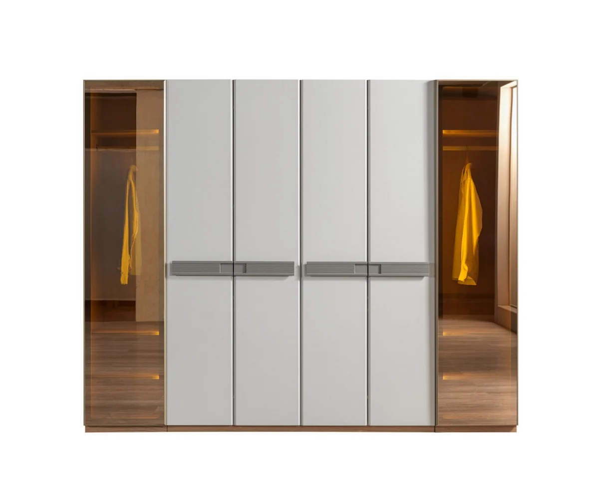 Takımın vazgeçilmez parçası olan büyük dolap sistemi, beyaz ve ahşap rengi birleşimiyle göz alıcı bir görünüm sergiler. Dolapın ortasında yer alan dört adet kapak, günlük kıyafetleriniz için geniş saklama alanı sunarken, yanlarında bulunan açık raflar ve LED ışıklı bölümler, özel eşyalarınızı sergileyebileceğiniz alanlar oluşturur. Dolapın ayna detaylı bölümleri, odayı daha geniş gösterme özelliğine sahiptir.