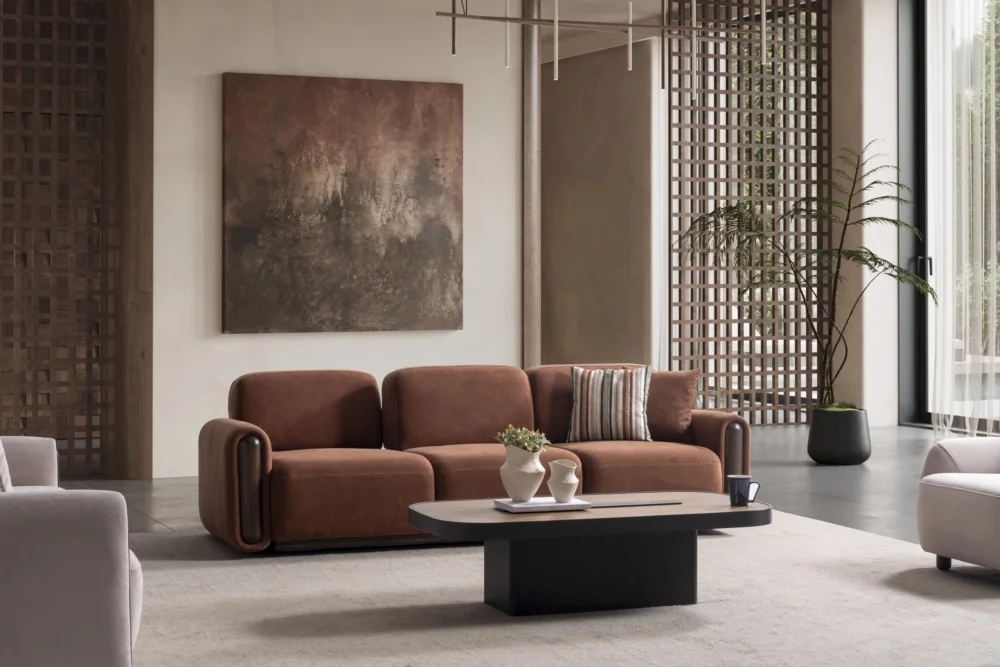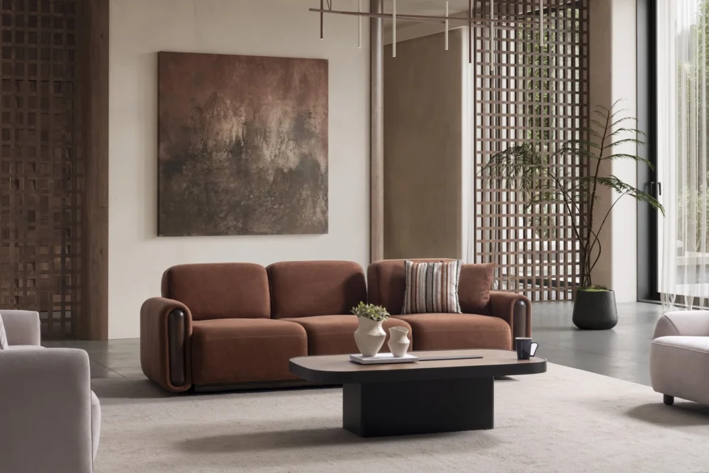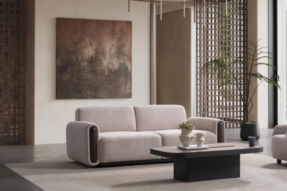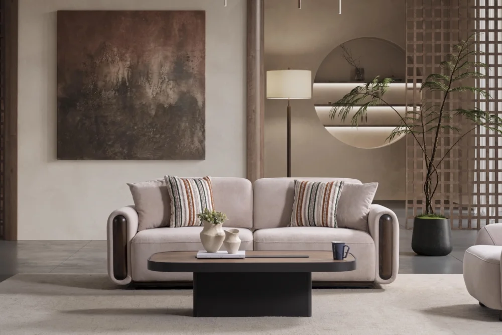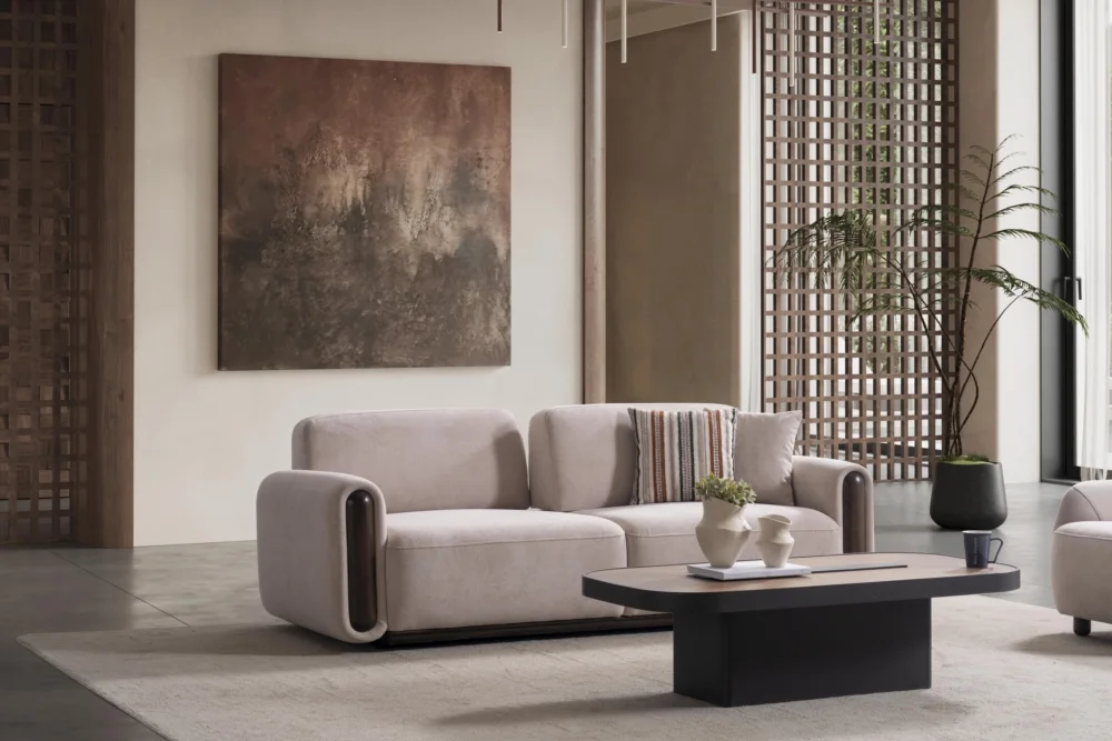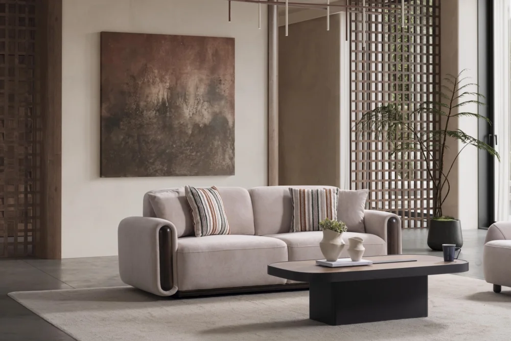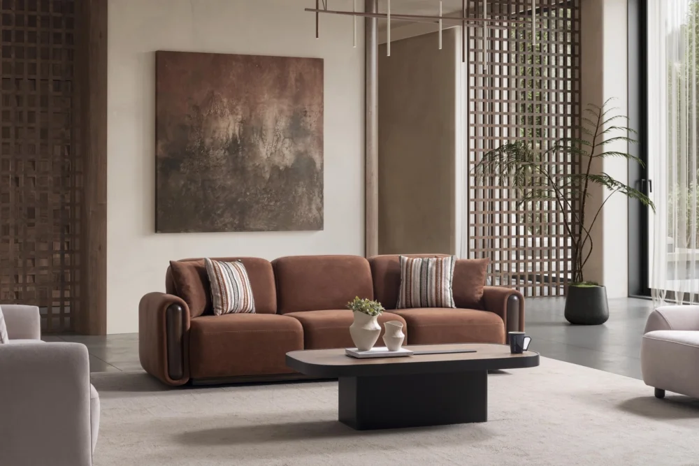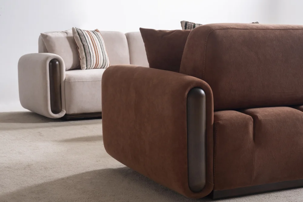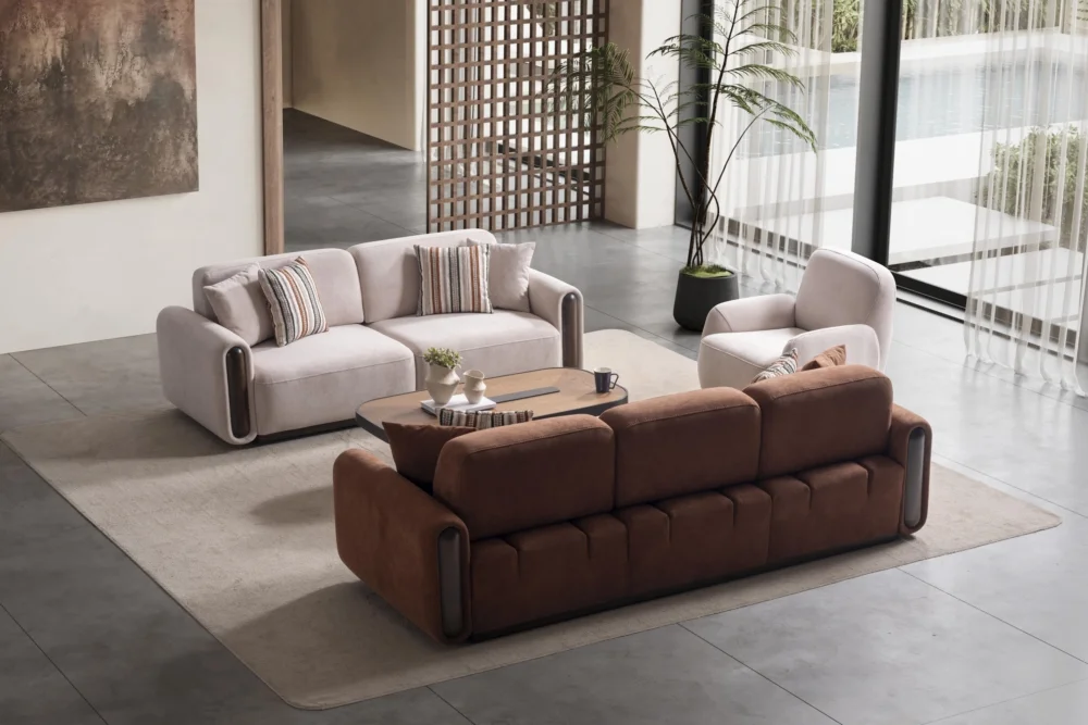 Aura Koltuk Takımı, çağdaş yaşam alanları için özenle tasarlanmış olup, kahverengi ve bej tonlarında sunulan renk seçenekleriyle her türlü dekorasyona mükemmel uyum sağlar. Yumuşak hatları ve minimal yaklaşımıyla dikkat çeken bu takım, evinizin atmosferini dönüştüren güçlü bir tasarım unsuru olarak öne çıkar. Çizgili yastıklar ve tek renk döşeme kumaşları arasındaki denge, görsel zenginlik yaratırken sadeliği korur.