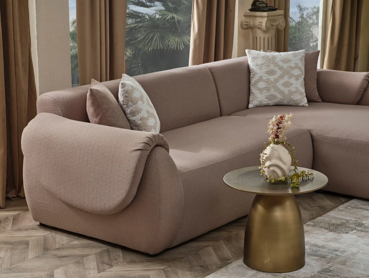 Colorado Köşe Takımı, vizon rengi kumaş kaplama ve zarif tasarımıyla oturma odalarınıza şıklık katıyor. Geniş oturma alanı ve rahat kullanım sunar.