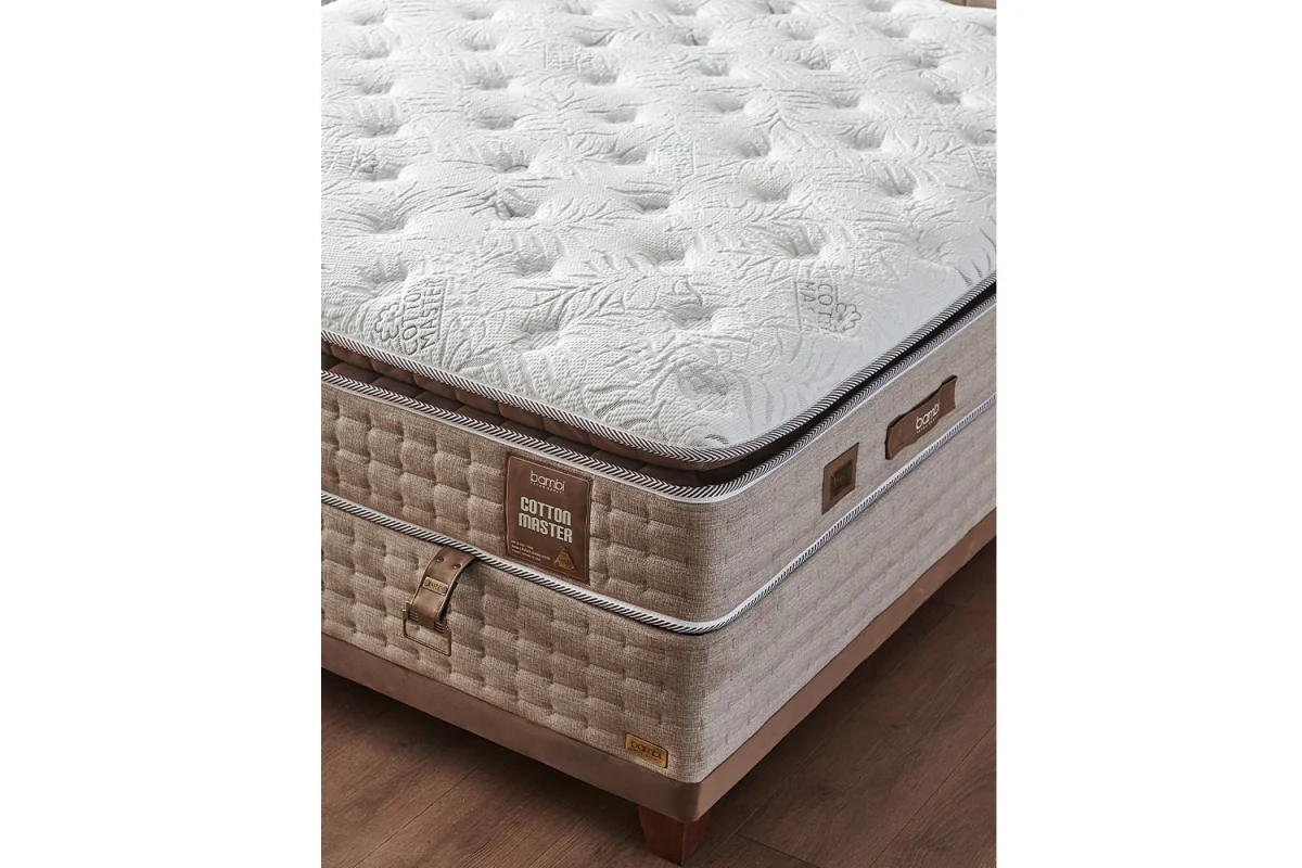 Cotton Master yatak takımı, pamuklu kumaş kaplama ve yaylı sistem ile konforlu uyku sunar. Özel rengi ile her dekorasyona uyum sağlar.