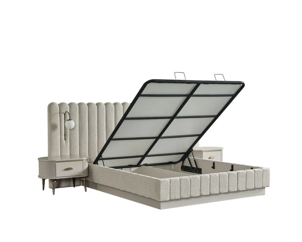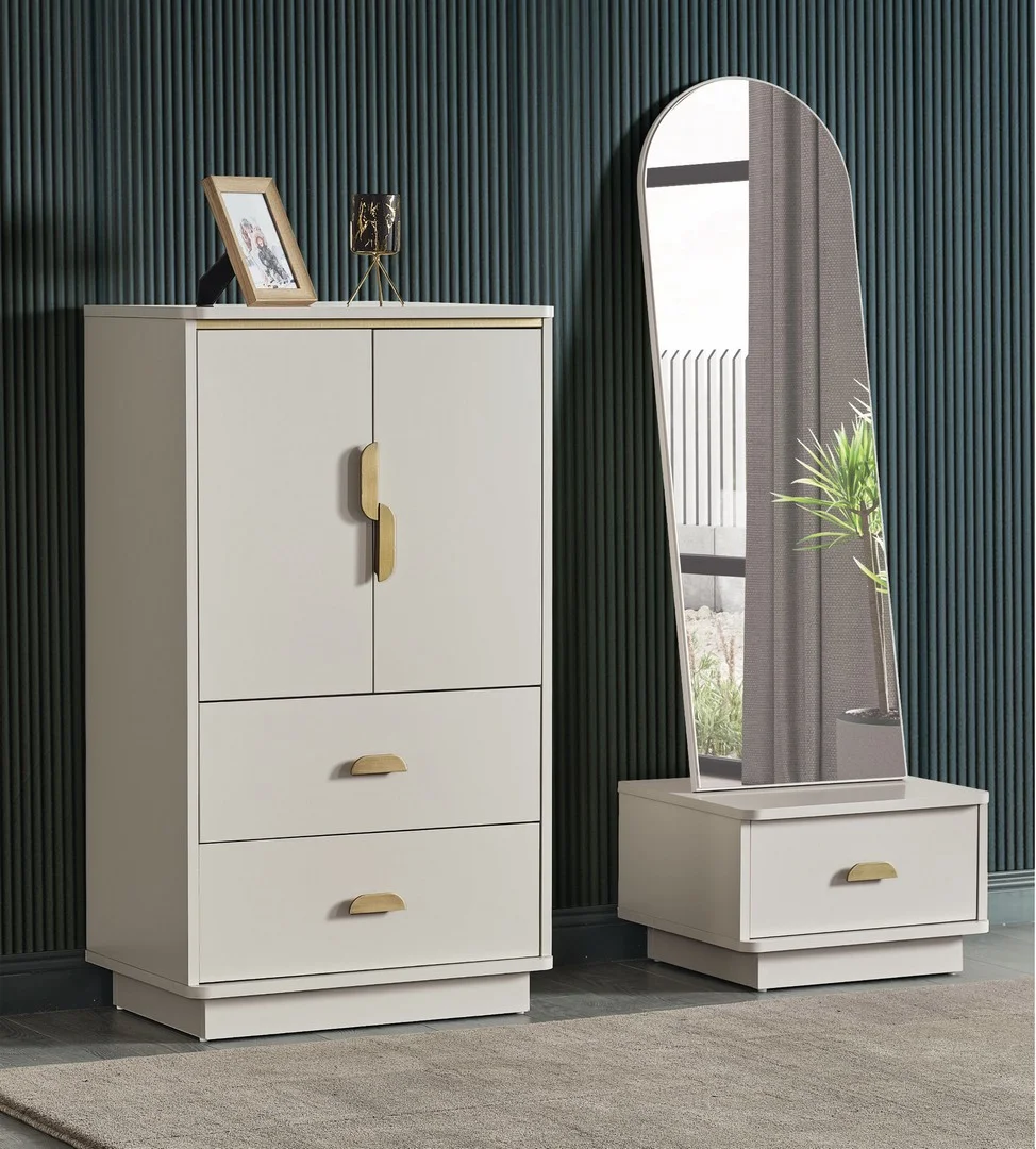 Dolce yatak odası takımı, yatak odanızı lüks bir ortama dönüştüren zarif tasarımıyla dikkat çeker. Krem rengi ana yapısı ve altın rengi detayları sayesinde hem sıcak hem de şık bir atmosfer yaratır. Yumuşak tonlarda tasarlanan bu takım, çağdaş yaşam tarzını klasik zarafet ile buluşturur. Dikey çizgili doku detayları, mobilyalara görsel derinlik kazandırırken, altın rengi kulplar ile tamamlanan tasarım anlayışı, odanıza değerli bir görünüm katar.