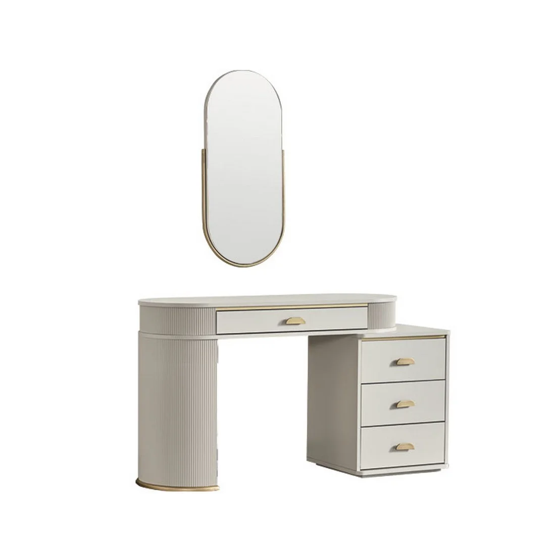 Dolce takımının makyaj masası, kişisel bakım rutininiz için özel olarak tasarlanmıştır. Oval şekilli aynası ile geniş görüş alanı sunarken, çok sayıda çekmecesi kozmetik ürünlerinizin düzenli saklanmasını sağlar. Puflu tabure, rahat oturma imkanı sunarken, masanın üzerindeki ışıklı bölmeler sayesinde makyaj yapma işlemi daha kolay hale gelir. Özel tasarımlı saklama bölmeleri, mücevherlerinizi ve küçük aksesuarlarınızı düzenli tutmanıza yardımcı olur.