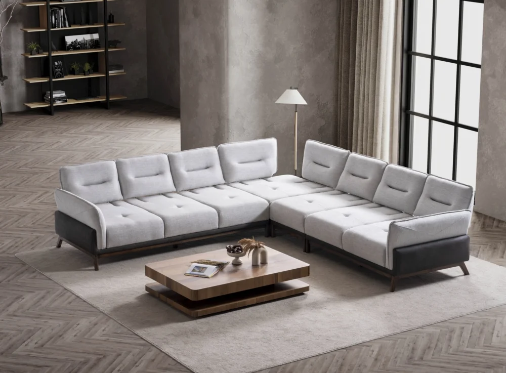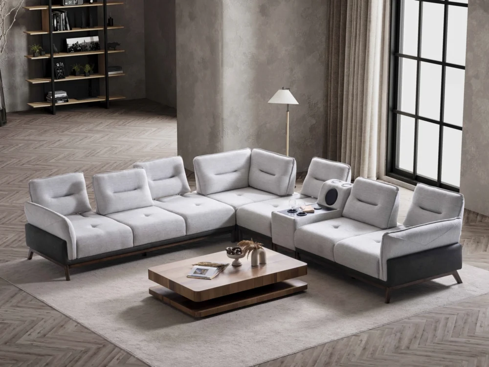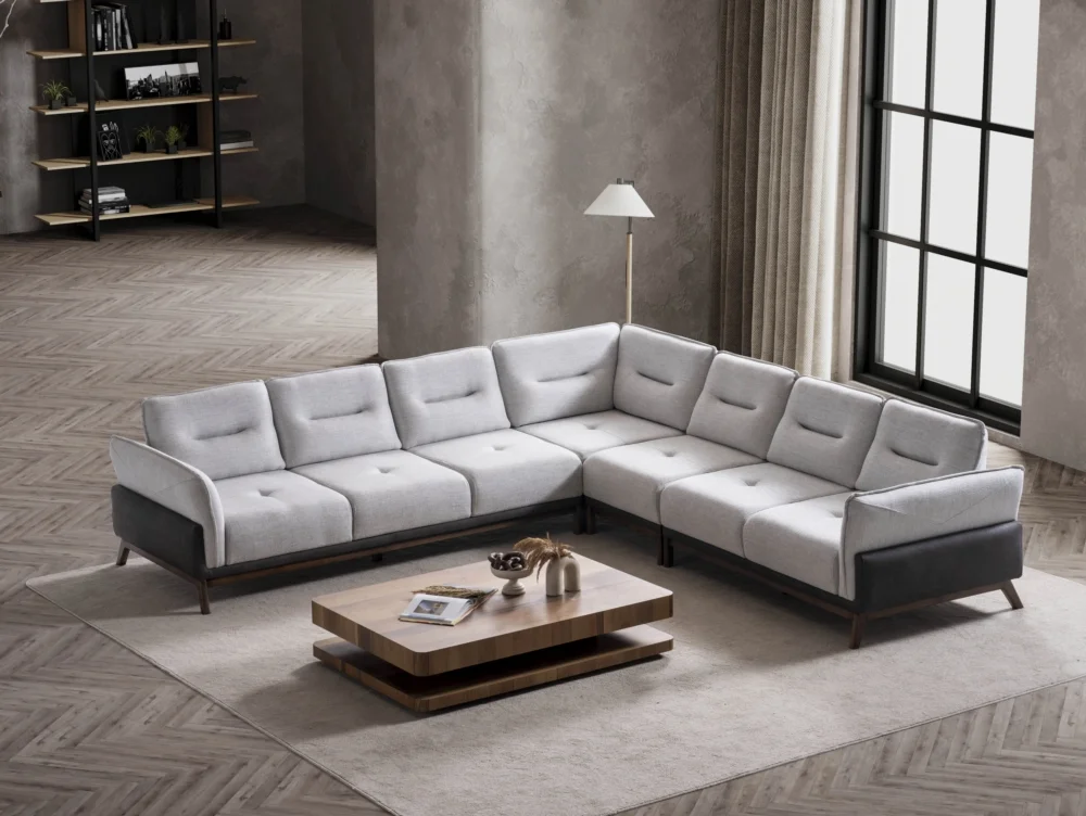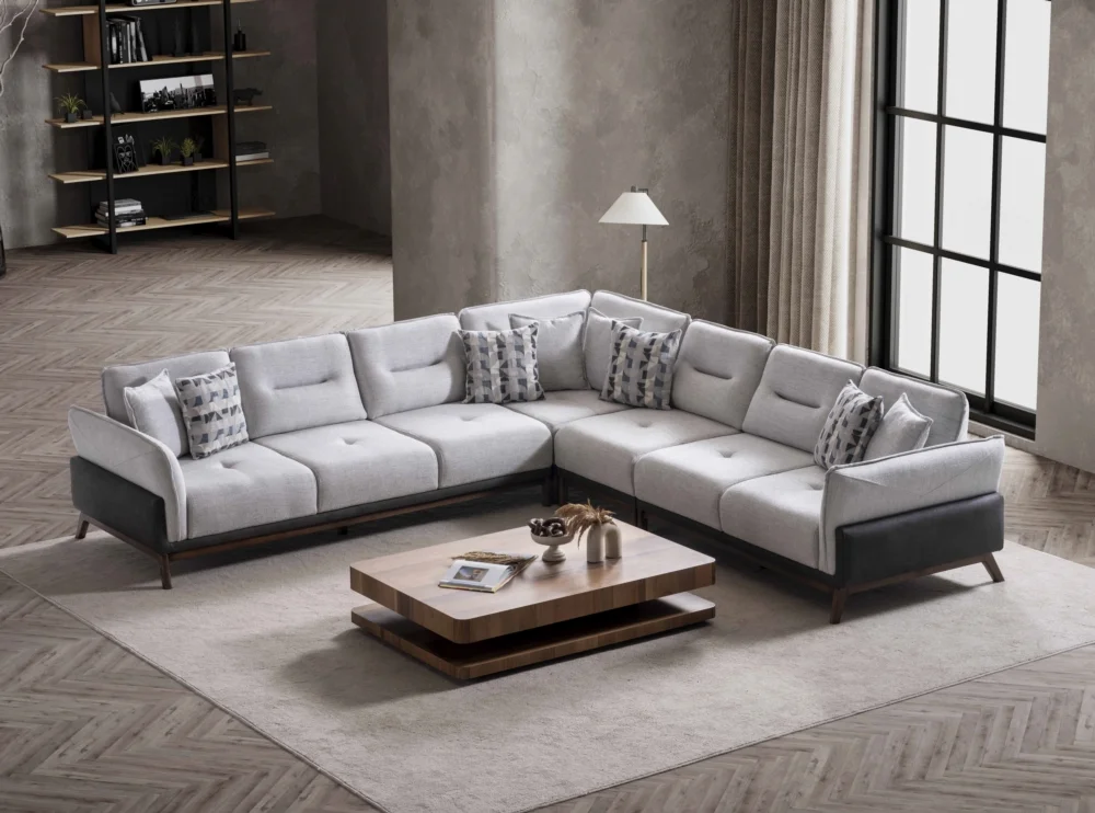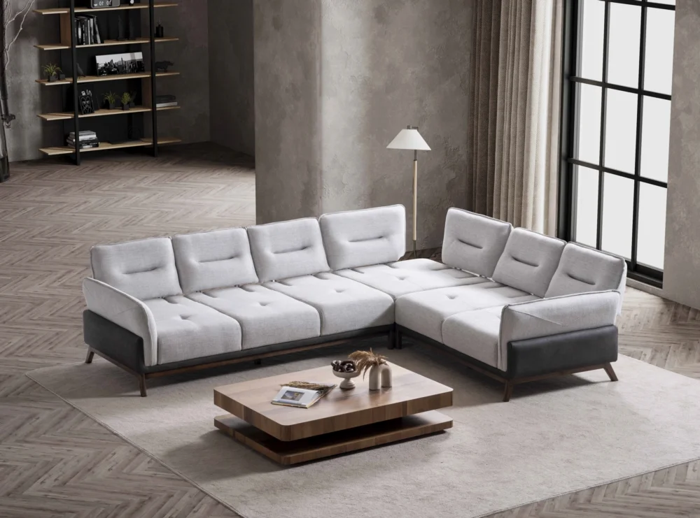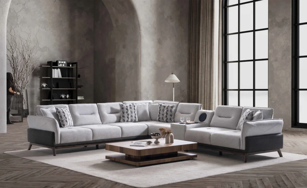 Fox Köşe Takımının nötr renk paleti, farklı dekorasyon tarzlarıyla uyumlu bir şekilde kullanılabilmesini mağlayar etmektedir. Gri ve siyah renklerin zarif birleşimi, hem minimal hem de klasik salon tasarımlarına mükemmel uyum sağlamaktadır. İnce ahşap ayakları ile yükseltilmiş tasarımı, zemin temizliğini kolaylaştırırken görsel olarak da hafiflik hissi yaratmaktadır. Bu özellik, özellikle küçük salonlarda ferahlık hissi oluşturmak için ideal bir çözümdür.