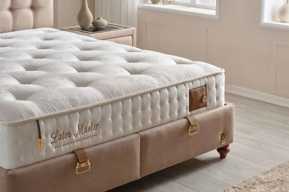 Latex Master, şık tasarımı ve üstün konforlu yatak deneyimi sunan kaliteli yatak takımıdır. Kapitoneli başlık ve çekmeceli yapısıyla yatak odanızı tamamlar.
