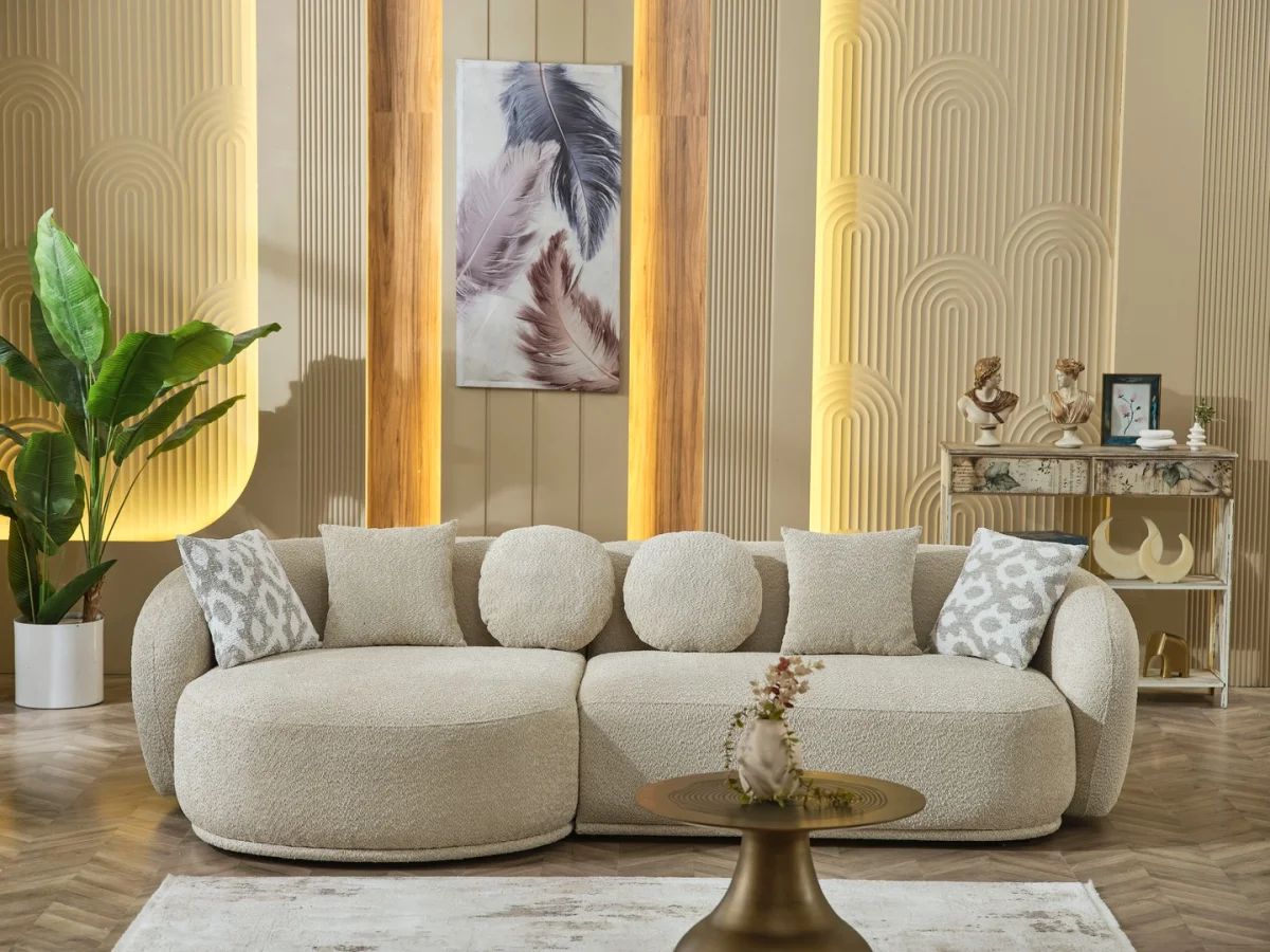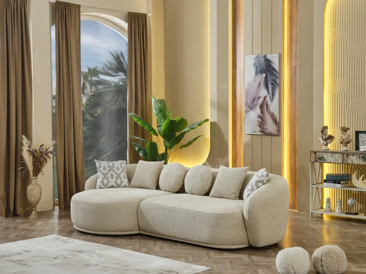 Leon Koltuk Takımı, contemporary tasarım anlayışını konforla buluşturan özel bir mobilya parçasıdır. Curved (kavisli) formları ve organik hatlarıyla dikkat çeken bu koltuk takımı, geleneksel köşeli tasarımların aksine yumuşak ve akıcı bir silüet sunar. Bej tonlarındaki kumaş kaplama, her türlü dekorasyon tarzına uyum sağlayabilecek nötr bir renk paleti oluşturur. Bu özelliği sayesinde Leon hem minimalist, hem de maksimalist iç mekan düzenlemelerinde mükemmel uyum gösterir.