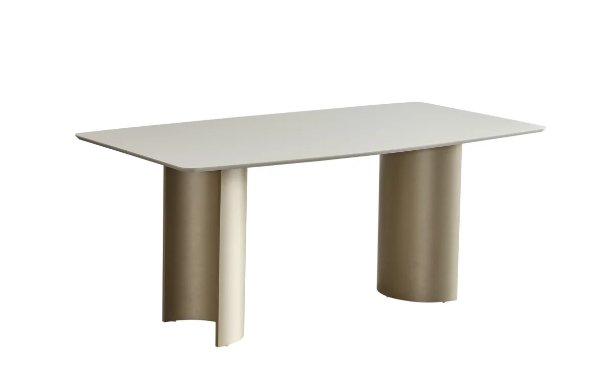 Takımın merkezinde yer alan dikdörtgen yemek masası, açık bej rengiyle dikkat çeker. Oval kenarları bulunan masa tablası, güvenli kullanım sağlarken estetik görünümü de tamamlar. Masanın ayağında kullanılan silindir tasarım, çağdaş bir hava katarken sağlamlık da sunar. Geniş masa yüzeyi, dört kişilik rahat oturma imkanı sağlar ve günlük kullanımdan özel davetlere kadar her duruma uyum gösterir.