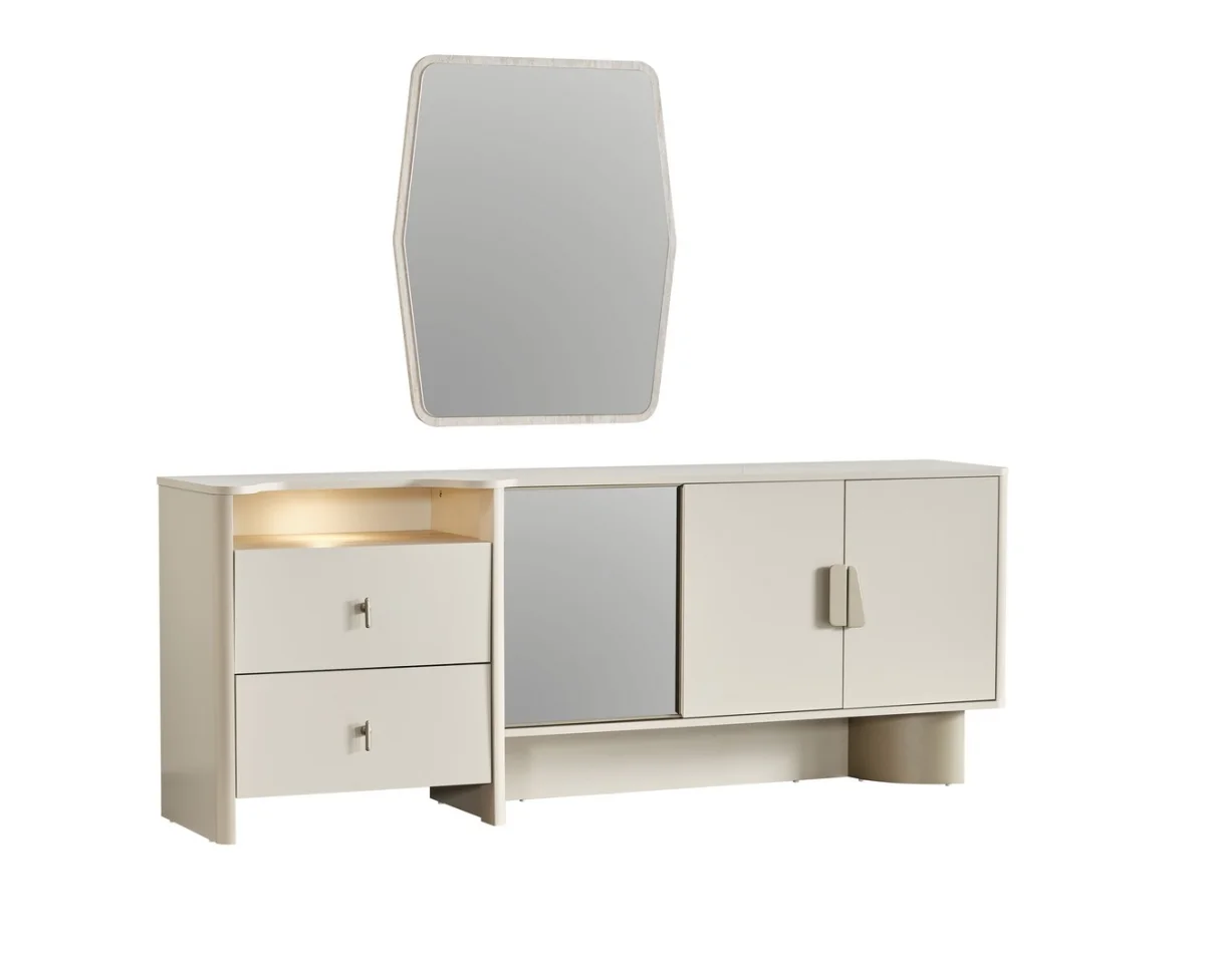 Takımı tamamlayan büfe, hem depolama hem de sunum işlevi görür. İki çekmece ve iki kapaklı bölümden oluşan büfe, yemek odası eşyalarınızı düzenli tutmanızı sağlar. Altın rengi metal kulplar, bej rengin sıcaklığıyla kontrast oluşturarak göze hoş gelen bir ayrıntı sunar. Büfe üzeri, dekoratif eşyalar için geniş bir sergileme alanı sağlarken, kapalı bölümleri günlük kullanım eşyalarınız için yeterli alan sunar.