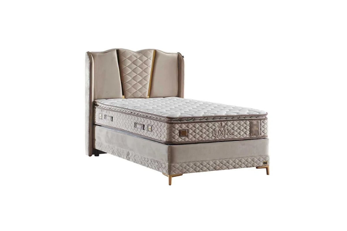Yatak tabanı ve başlık, dayanıklı kumaş kaplama ile kaplanmıştır. Altın renkli metal ayaklar, takımın tümüne birinci sınıf bir görünüm kazandırırken, zeminden yükseklik sağlayarak yatak altı temizliğini kolaylaştırır. Yatak üzerinde görülen Luxia markası, kalite güvencesinin bir göstergesidir. Kapitone dikişler, sadece görsel zenginlik katmakla kalmaz, aynı zamanda dolgusal malzemenin eşit dağılımını sağlar.