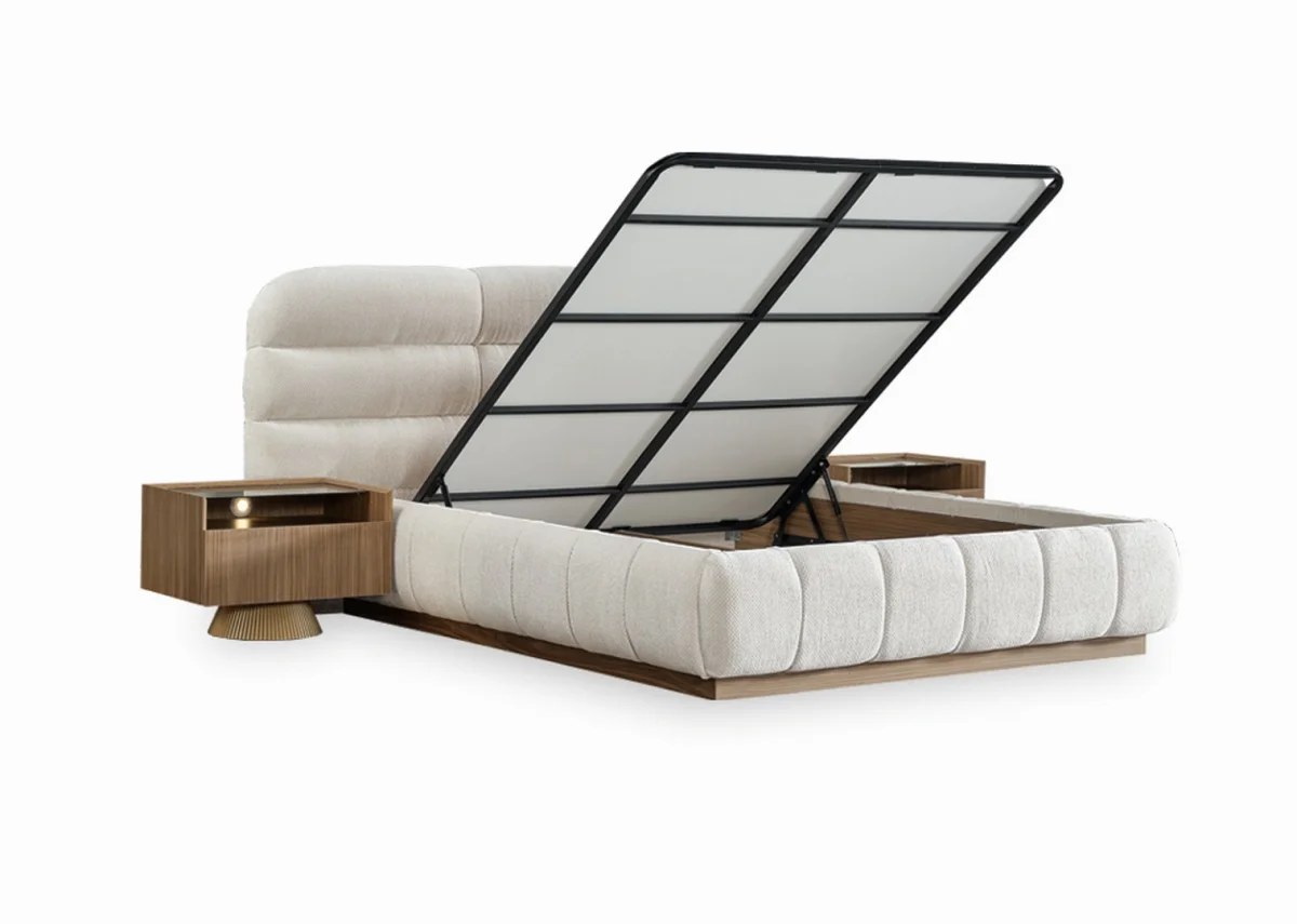 Madrid takımının tüm parçaları, yüksek kaliteli malzemelerden üretilmiştir. Doğal ahşap desenli yüzeyler, uzun yıllar boyunca bozulmadan güzelliğini korur. Yatak başlığının yumuşak kapitone detayları, konfor ve şıklığı bir araya getirir. Geniş pencerelerden doğal ışığı alan tasarım, açık ve ferah bir yatak odası atmosferi yaratır.