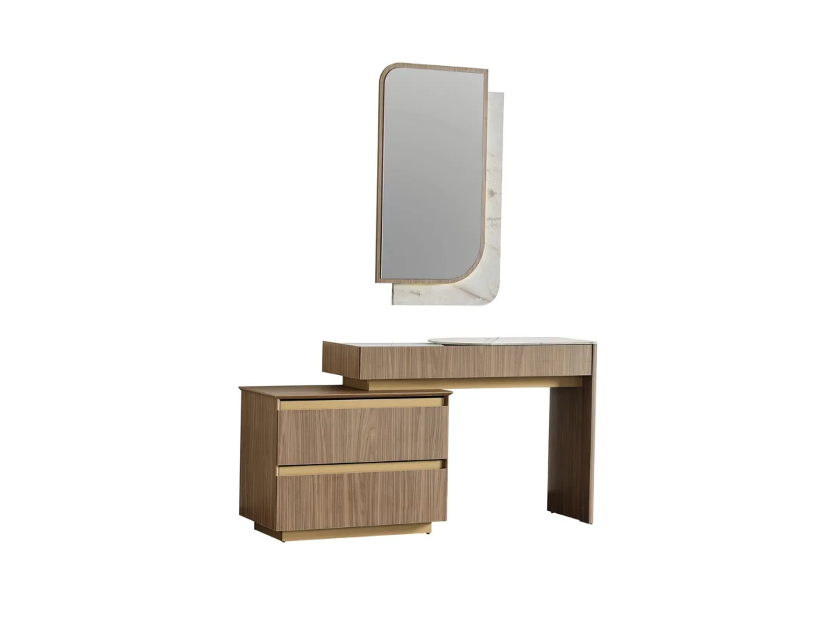 Madrid takımının tuvalet masası, kişisel bakım rutininizi keyifli hale getirir. Geniş masası üzerinde kozmetik ürünlerinizi rahatça kullanabilir, büyük aynası sayesinde her açıdan kendinizi görebilirsiniz. Altındaki çekmeceler, makyaj malzemeleriniz ve aksesuar koleksiyonunuz için özel bölümler sunar. Beyaz pufu ile birlikte tam bir güzellik köşesi oluşturur.