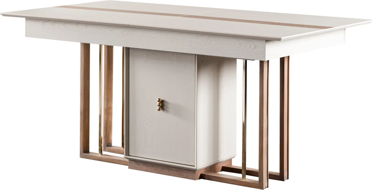 Takımın merkezinde yer alan genişletilebilir yemek masası, günlük kullanım ve özel davetler için ideal çözüm sunar. Masanın beyaz yüzeyi, ahşap şeritlerle zenginleştirilmiş olup, görsel derinlik yaratır. Altında yer alan dolap bölümü, yemek takımları ve peçeteler için ekstra saklama alanı sağlar. Genişletme mekanizması sayesinde masa boyutu ihtiyaca göre ayarlanabilir, böylece hem günlük kullanımda hem de misafir ağırlarken rahatlık sunar.