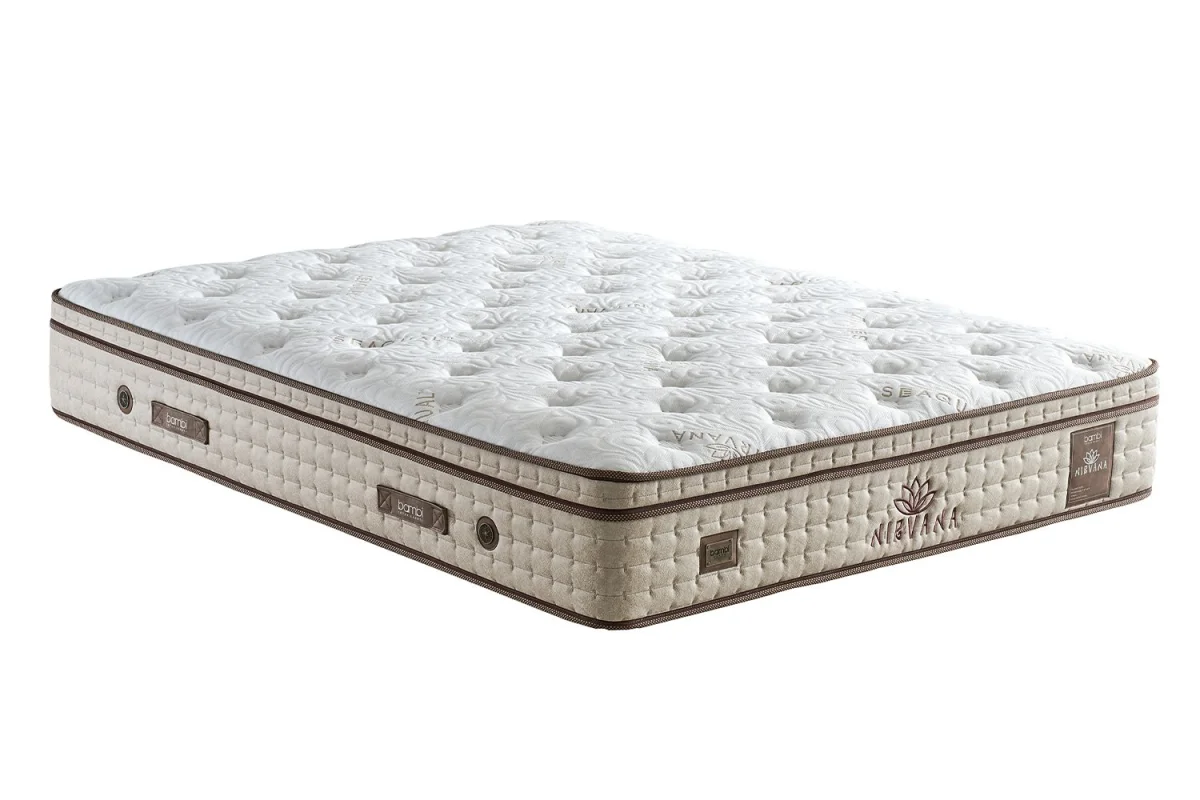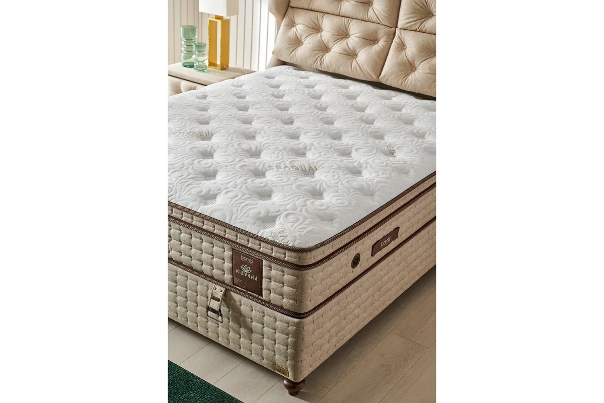 Nirvana yatak takımının kalbi olan yatak, çok katmanlı yapısıyla üstün uyku konforu sağlar. Özel kumaş kaplama, nefes alabilir özelliği sayesinde terlemeyi önler ve hijyenik bir uyku ortamı yaratır. Yaylı sistem, vücut ağırlığını eşit şekilde dağıtarak omurga sağlığınızı korur.