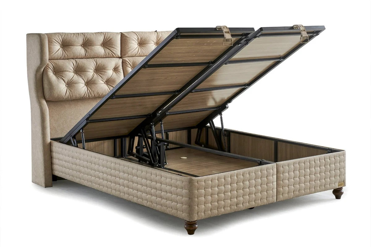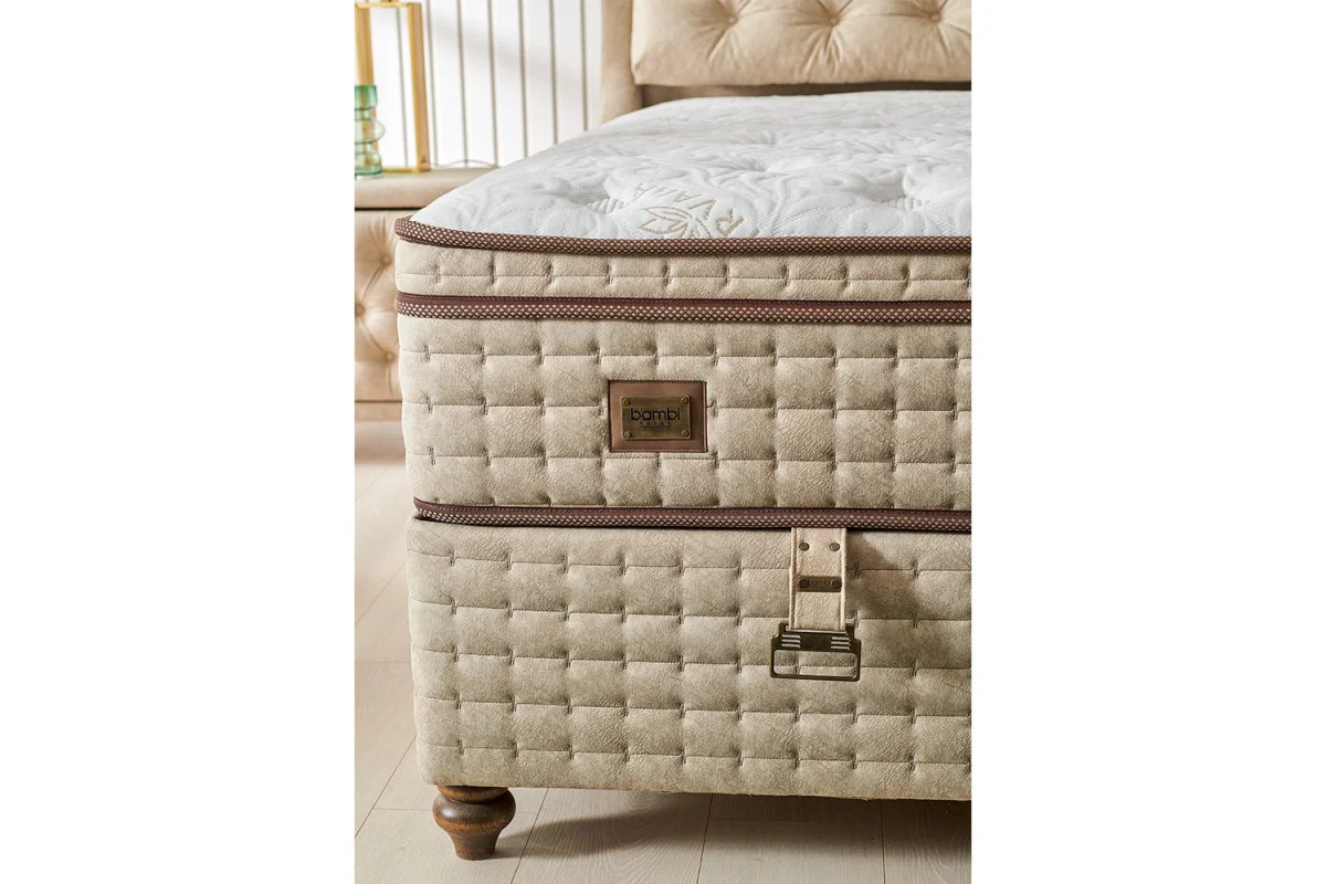 Nirvana yatak takımı, yatak odanızda konfor ve zarafeti bir araya getiren özel bir üründür. Kapitoneli başlık tasarımı ve bej renk tonlarıyla her dekorasyon tarzına uyum sağlar. Yüksek kaliteli malzemelerden üretilen bu yatak takımı, uzun yıllar kullanım garantisi sunar.