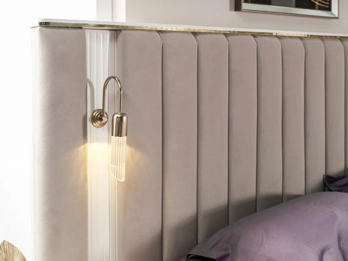 Takımın merkezi olan yatak, yüksek kaliteli dikey çizgili baş ucu döşemesi ile dikkat çeker. Yumuşak kumaş kaplama, yatak başlığına yaslandığınızda maksimum konfor sağlar. Yatak çerçevesi, sağlam ahşap malzemeden üretilmiş olup, modern metal ayaklar sayesinde hem dayanıklı hem de şık bir görünüm elde eder. Geniş yatak yüzeyi, rahat uyku için gerekli alanı fazlasıyla karşılar.