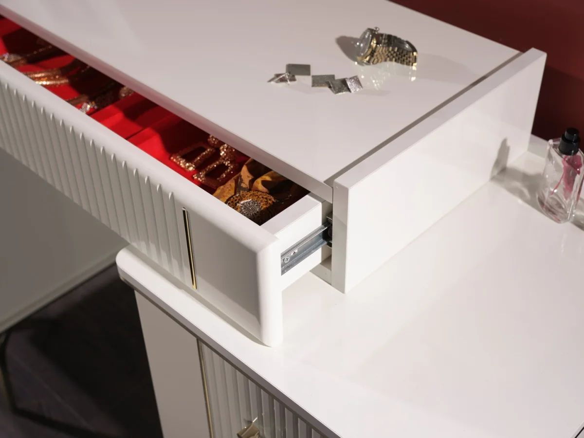 Takımla birlikte gelen büyük gardırop, yatak odası düzeninizi sağlamak için tasarlanmıştır. Çok kapılı tasarımı ile giyim eşyalarınızı kategorilere ayırarak düzenli bir şekilde saklama imkanı sunar. İç kısımda askılık bölümleri, raf alanları ve çekmeceler bulunur. Altın renkli detaylar ve cam paneller, gardırobun şık görünümüne katkıda bulunur. Sessiz kapanış sistemi ile kapaklar yumuşak bir şekilde kapanır.