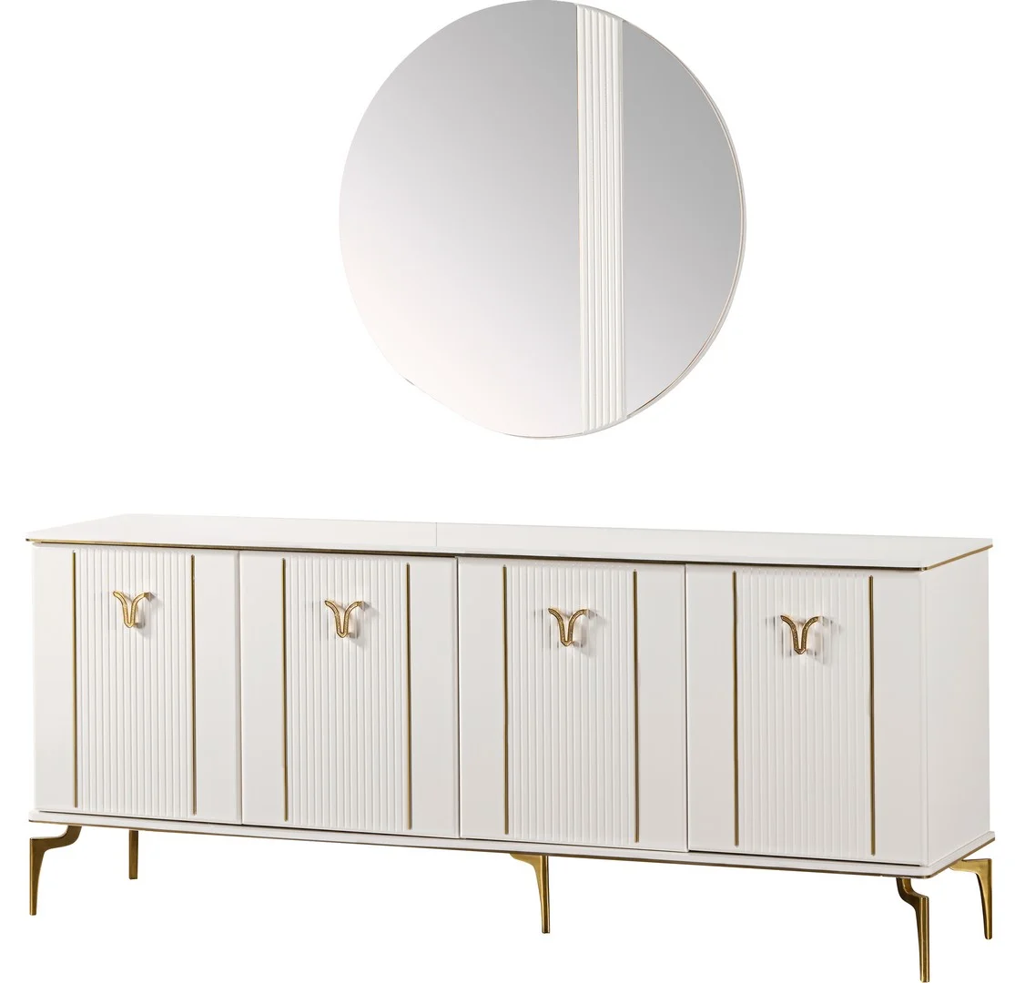 Panora Yemek Odası, beyaz renk ve altın detaylarıyla zarif bir görünüm sunan çağdaş yemek odası takımıdır. Genişletilebilir masa ve şık sandalyelerle konforunuzu artırır.