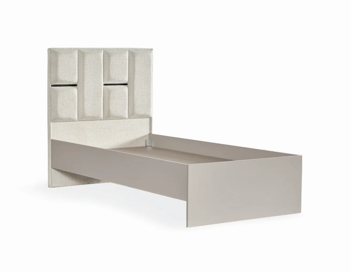 Takımın kalbi olan tek kişilik yatak, yüksek başlık tasarımıyla dikkat çeker. Başlık kısmındaki dikişli detaylar zarif bir görünüm yaratırken, yanındaki komodin pratik saklama alanı sunar. Yatak yanında yer alan aynalı dolap hem giyinme hem de odayı ferah gösterme işlevini yerine getirir. Dolapın üzerinde saklanan gitar, gençlerin kişisel eşyalarını sergileyebileceği alanları göstermektedir.