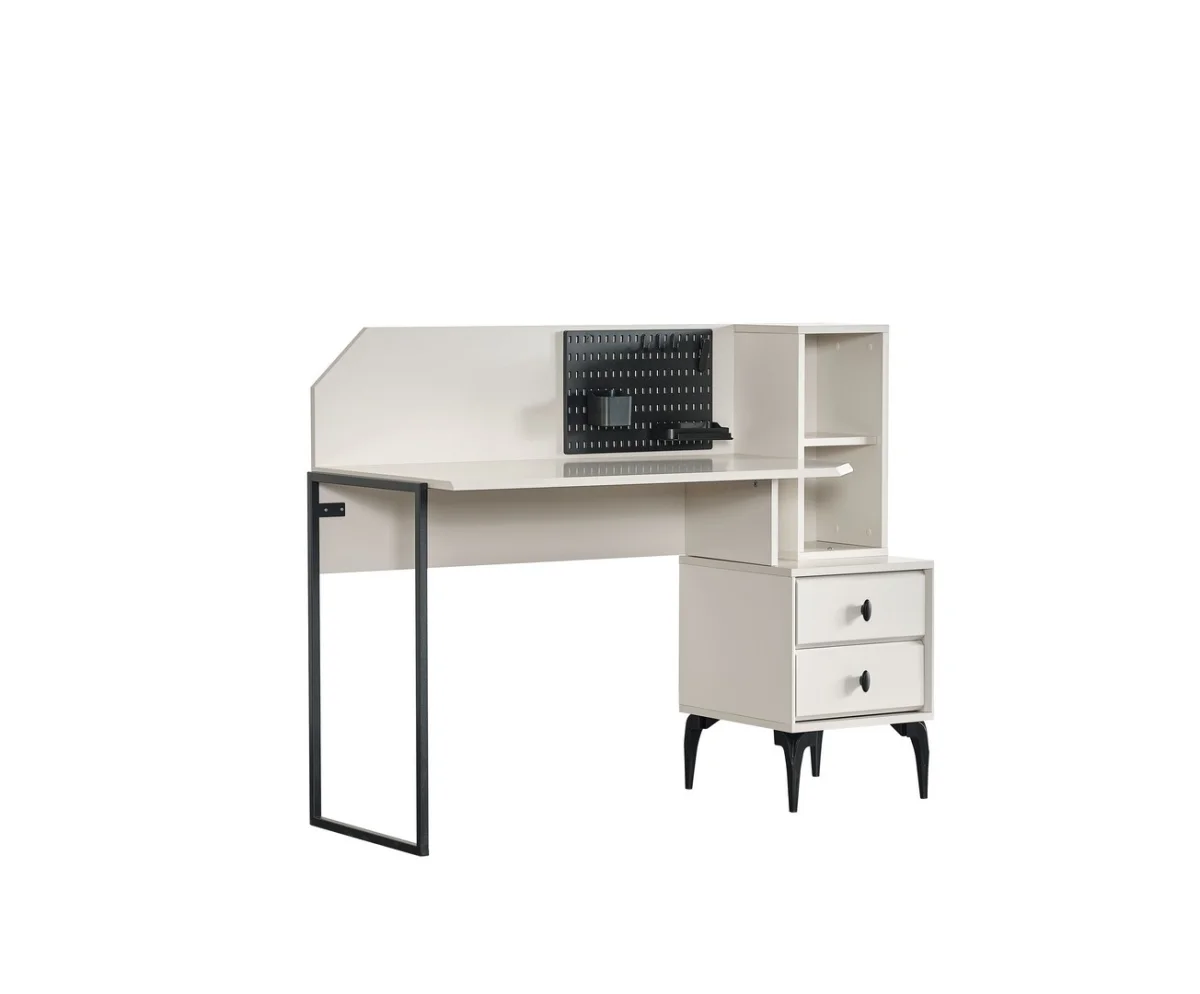 Petra'nın en öne çıkan özelliklerinden biri, entegre çalışma masasıdır. Geniş masası ile rahat çalışma imkanı sunarken, çekmeceli alt kısmı önemli eşyaların düzenli saklanmasını sağlar. Masanın arkasında bulunan özel organizasyon panosu ise çığır açıcı bir yenilik sunar. Delikli siyah panel üzerine takılabilen kalemlik ve raflar sayesinde masa üzeri her zaman düzenli kalır.