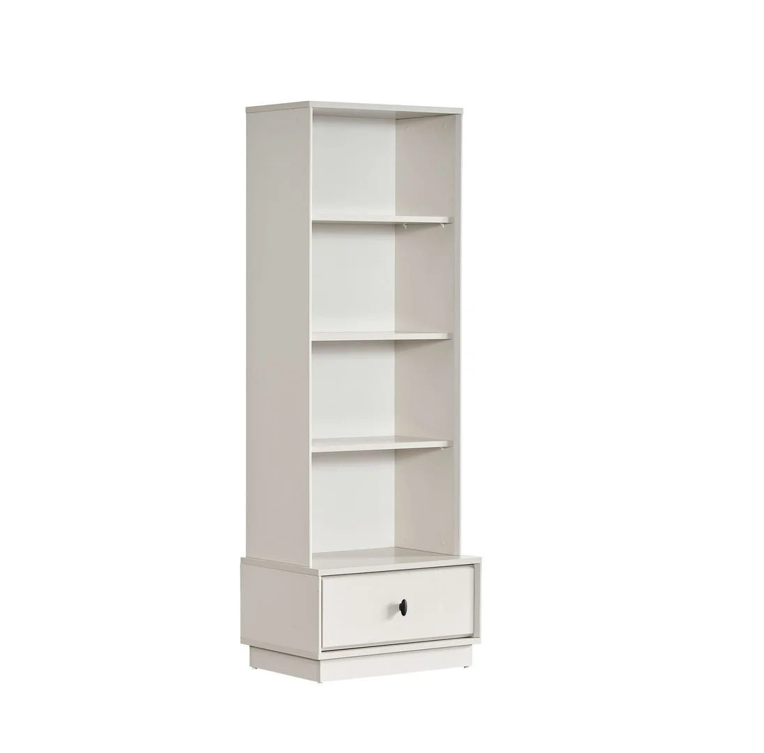 Yüksek kitaplık bölümü, hem kitaplar hem de dekoratif eşyalar için geniş alan sağlar. Alt kısmında yer alan çekmeceli bölüm ise özel eşyaların güvenli saklanması için idealdir. Tüm mobilyalar, siyah konik ayaklar üzerinde yükselerek odaya hafif ve havadar bir görünüm kazandırır.