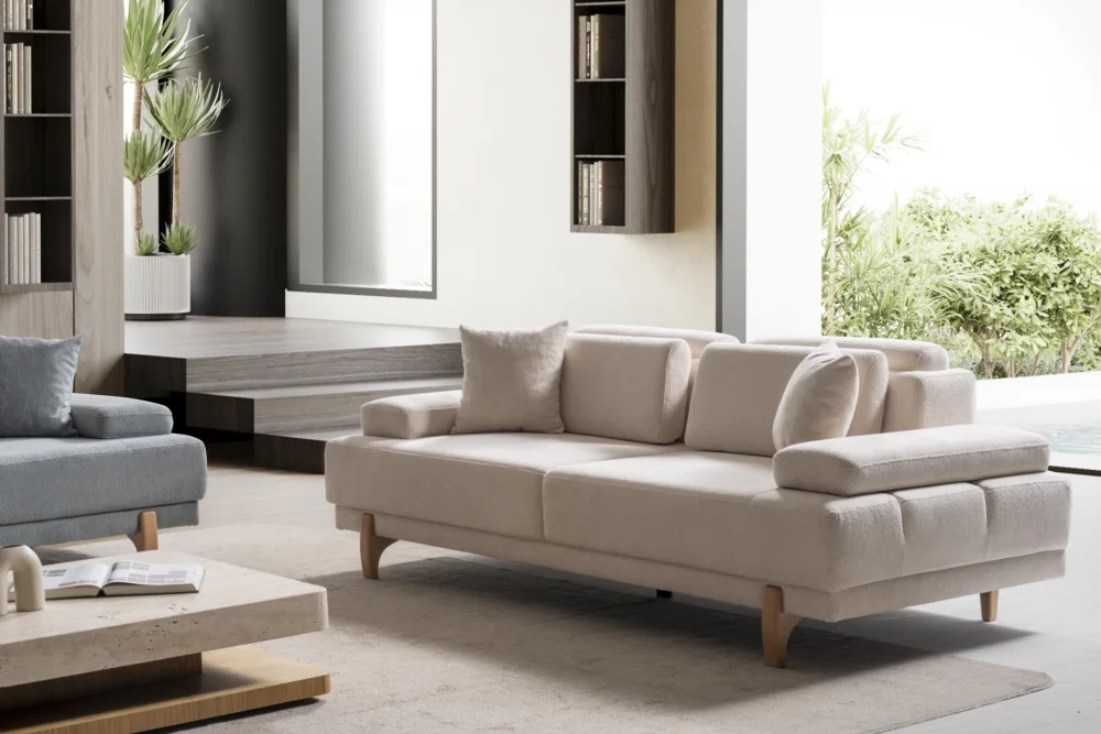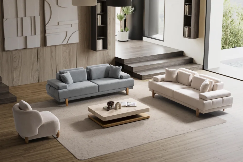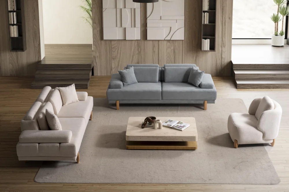 Poblo Koltuk Takımı, günümüz yaşam alanlarının ihtiyaçlarını karşılamak üzere özenle tasarlanmış bir mobilya grubudur. Gri ve bej tonlarındaki kumaş kaplama seçenekleriyle farklı dekorasyon tarzlarına uyum sağlar. Ahşap ayak detayları doğal bir görünüm katarken, sağlam yapısı uzun yıllar kullanım imkanı sunar. Takım, üçlü koltuk, ikili koltuk ve tekli koltuk seçenekleriyle geniş aileler için ideal çözümler sunar.