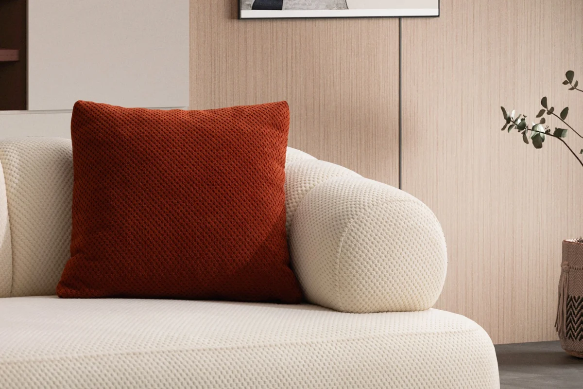 Polo Koltuk Takımı terracotta ve krem renklerinin mükemmel uyumuyla yaşam alanlarınızda görsel bir şölen oluşturur. Ana koltuk terracotta kumaş kaplamasıyla dikkat çekerken, krem rengi berjerler arasında dengeli bir kontrast yaratır. Yuvarlak hatları ve organik formlarıyla çağdaş yaşam tarzına uygun bir görünüm sergiler. Takımın her bir parçası estetik açıdan birbirini tamamlayan unsurlarla tasarlanmıştır.