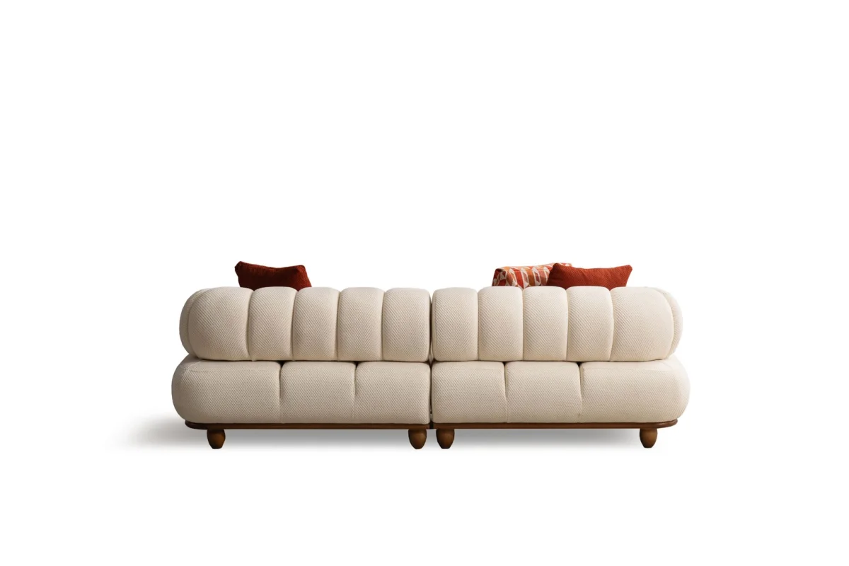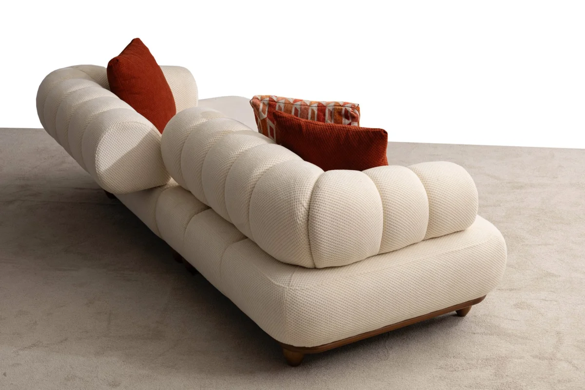 Ahşap ayaklar, doğal malzeme kullanımını ön plana çıkararak sıcak bir atmosfer yaratır. Koltukların yuvarlak kenarları ve yumuşak hatları, keskin köşelerin aksine daha samimi ve davetkar bir ortam oluşturur. Bu tasarım anlayışı, hem görsel hem de kullanım açısından üstün deneyim sunar.