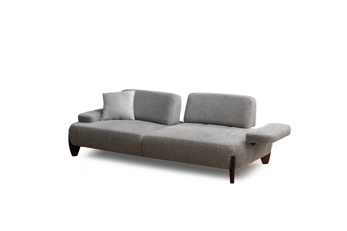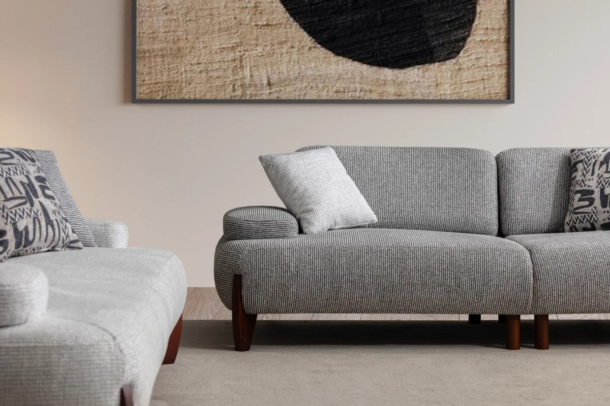 Puma Koltuk Takımı, gri kumaş kaplama ve ahşap ayakları ile yaşam alanlarınız için zarif ve rahat bir oturma çözümü sunar.