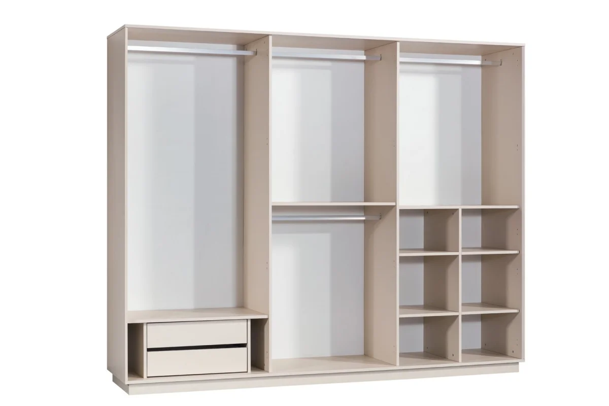 Rio Yatak Odası Takımının gardırobu, altı kapılı geniş yapısıyla tüm giyim ihtiyaçlarınıza cevap verir. İki adet ayna kapısı sayesinde odanızı daha geniş gösterirken, hazırlanma anlarınızda pratiklik sağlar. İç bölmeleri düzenli olarak tasarlanmış gardırop, askılık bölümü ve raf sistemleriyle kıyafetlerinizi düzenli bir şekilde saklamanıza olanak tanır. Alt bölümündeki çekmeceler, küçük eşyalarınız için ek saklama alanı sunar.