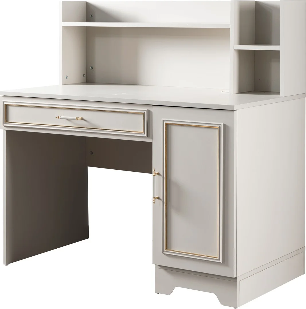 Takımın çalışma masası, gençlerin ders çalışma ve bilgisayar kullanım ihtiyaçlarını karşılamak üzere geniş yüzey alanı ve pratik çekmece sistemi ile tasarlanmıştır. Masa üzerindeki raf sistemi, kitapları ve çalışma malzemelerini düzenli tutmaya yardımcı olurken, kapalı dolap bölümü önemli evrakların güvenli saklanmasını sağlar. Yanında yer alan uzun kitaplık ünitesi ise çok sayıda kitap, süs eşyası ve kişisel koleksiyonlar için geniş depolama alanı sunar.