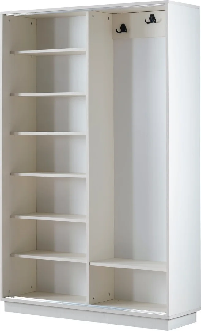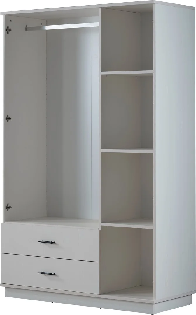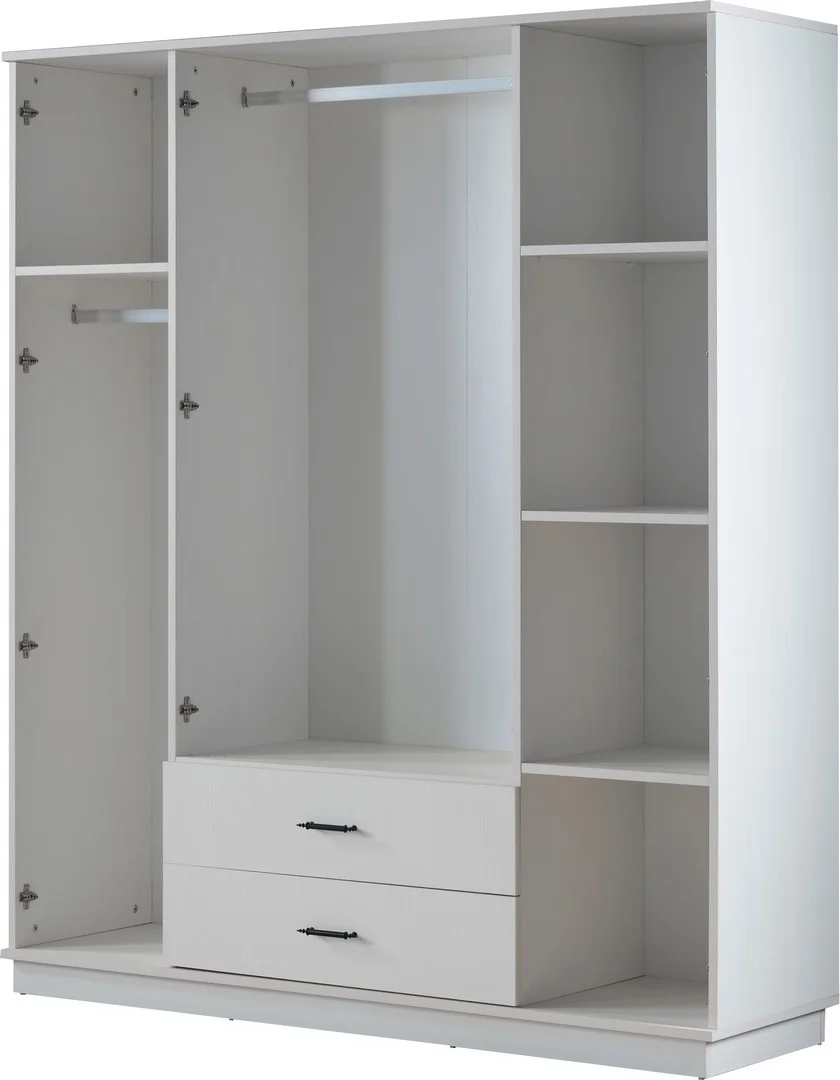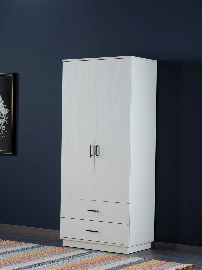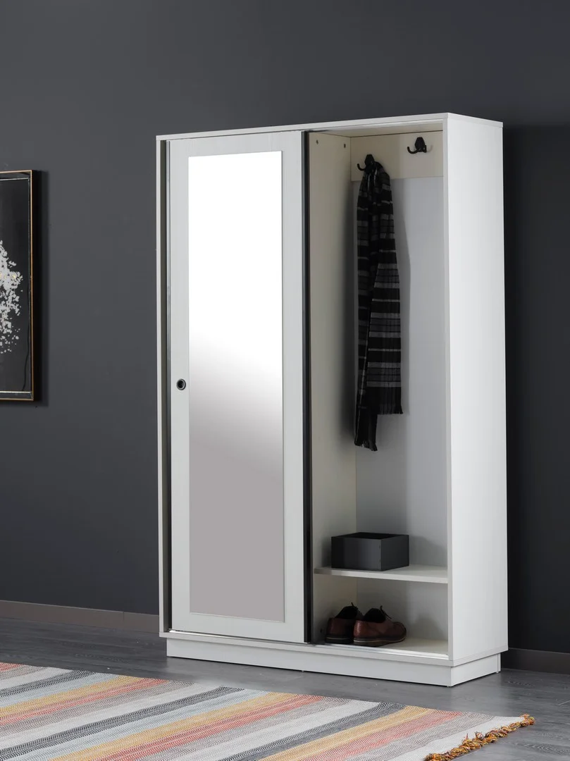 Takımın en dikkat çeken parçası olan gardırop, farklı depolama bölümleriyle eşyalarınızı düzenli tutmanızı kolaylaştırır. İçerisinde askılık bölümü, raflar ve çekmece bulunur. Aynalı kapağı sayesinde giyinme işlemlerinizi rahatlıkla gerçekleştirebilirsiniz. Yüksek kaliteli menteşeler ve tutamaklar uzun yıllar sorunsuz kullanım garantisi verir.