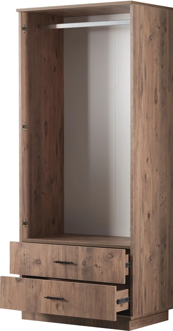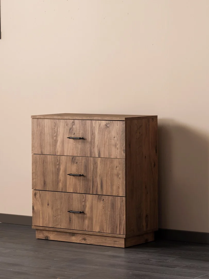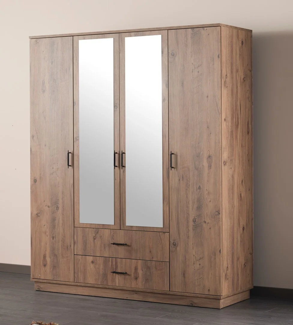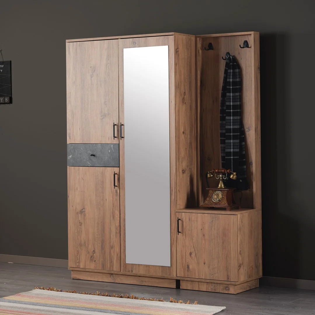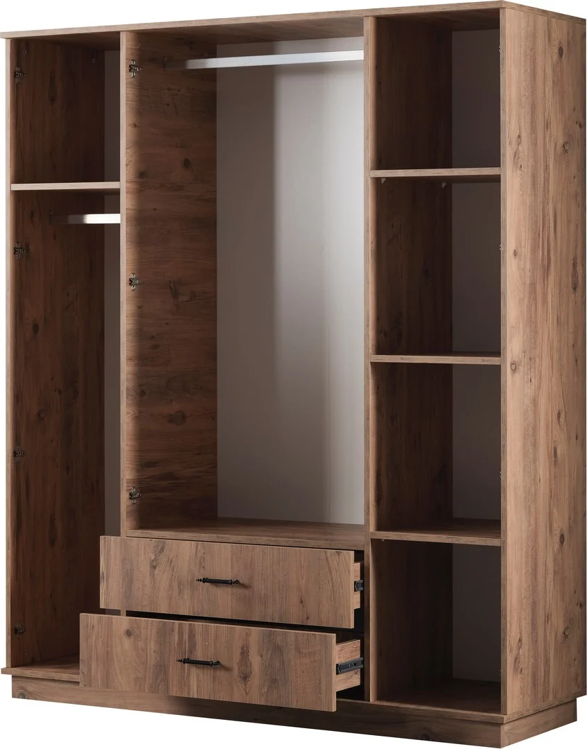 Takım, yüksek kaliteli yongalevha ve melamin kaplama teknolojisiyle üretilmiştir. Ceviz desenli yüzey, çizilmelere ve lekelere karşı dirençli özellik gösterir. Metal aksamlar paslanmaz çelik kalitesinde olup, uzun süre sorunsuz kullanım sağlar. Çekmecelerde bulunan ray sistemleri, sessiz ve pürüzsüz hareket kabiliyeti sunar. Gardırop kapıları, kaliteli menteşeler sayesinde yıllarca sorunsuz açılıp kapanır.
