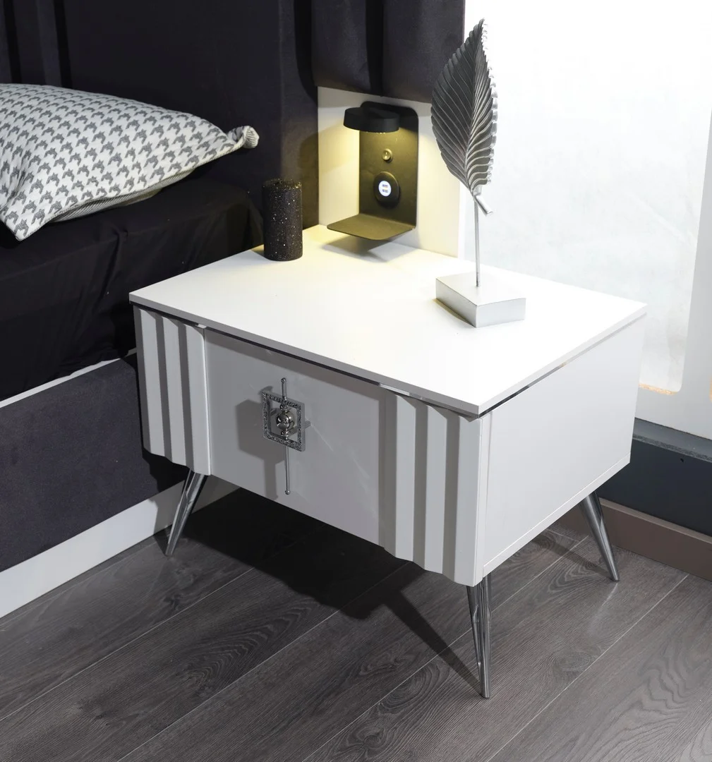 Tesla yatak odası takımı, gri ve beyaz tonlarında çağdaş tasarım sunar. Kaldırmalı baza, geniş dolap ve komodinlerle eksiksiz yatak odası çözümü.