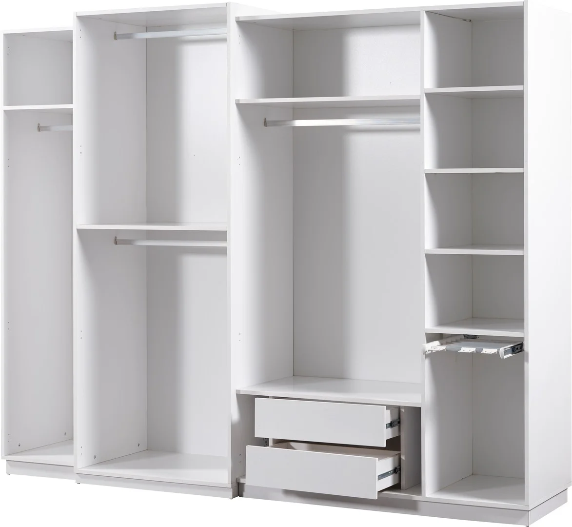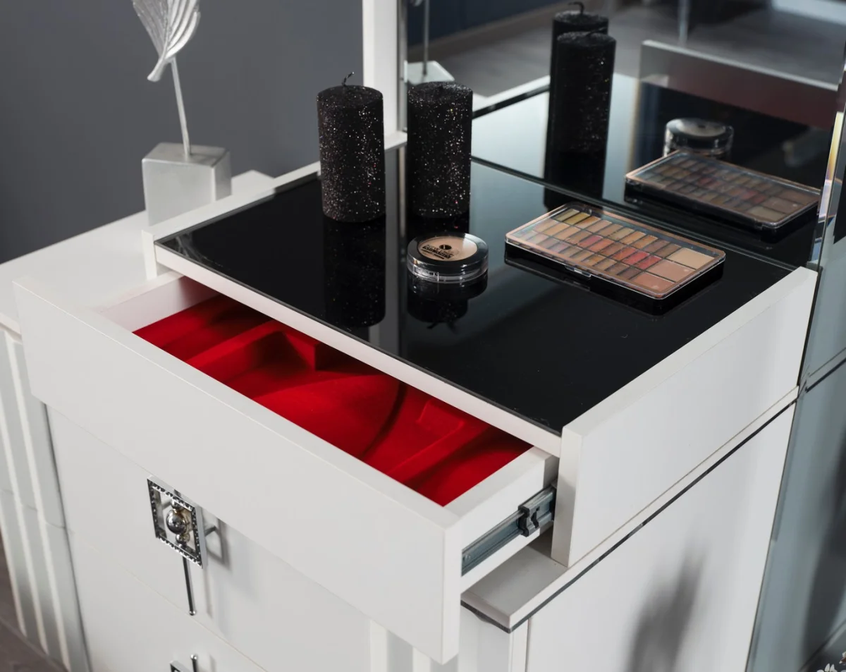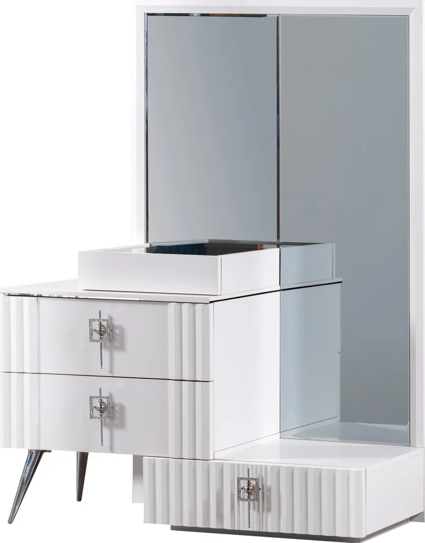 Tesla yatak odası takımının bir parçası olan geniş dolap sistemi, beyaz renkteki kapakları ile odanın genel estetiğine uyum sağlar. Çok bölmeli iç tasarımı sayesinde kıyafetlerinizi düzenli olarak saklayabilirsiniz. Dolapla birleşik ayna sistemi, odanın ferah görünmesini sağlarken, günlük hazırlık rutininizi kolaylaştırır. Ayna yüzeyleri, odaya derinlik hissi katarak alanın daha büyük görünmesine yardımcı olur.