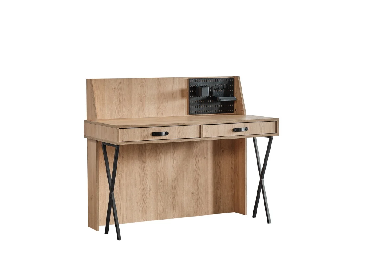 Çalışma masası, gençlerin ders ve proje çalışmalarını rahatça yapabilmesi için geniş yüzeye sahiptir. Masanın üst bölümünde yer alan organizatör kısmı, kalem, kitap ve diğer çalışma malzemelerinin düzenli tutulmasını sağlar. Alt kısmındaki çekmece ise önemli belgelerin güvenle saklanmasına imkan tanır. X şeklindeki metal ayaklar, masaya sağlam bir duruş kazandırırken çağdaş görünüm yaratır.