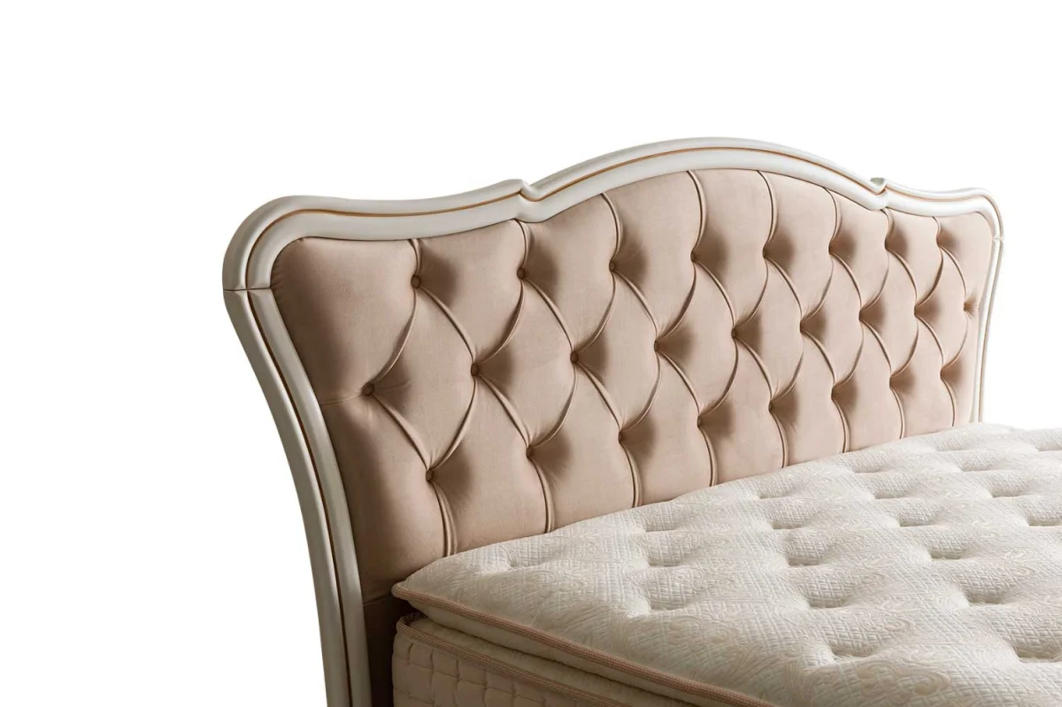 Kapitone tekniğiyle işlenmiş başlık geleneksel el işçiliğinin modern yorumu olarak öne çıkıyor. Her bir düğme detayı özenle yerleştirilmiş, yüksek kaliteli deri döşeme ile dayanıklılık garantisi sunuyor. Beyaz ahşap çerçeveler ürüne sofistike bir görünüm kazandırırken, uzun yıllar boyunca formunu koruyor.