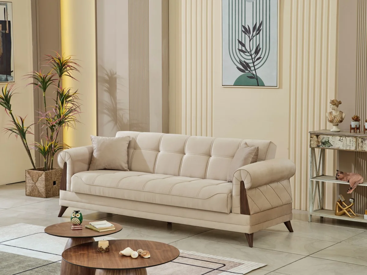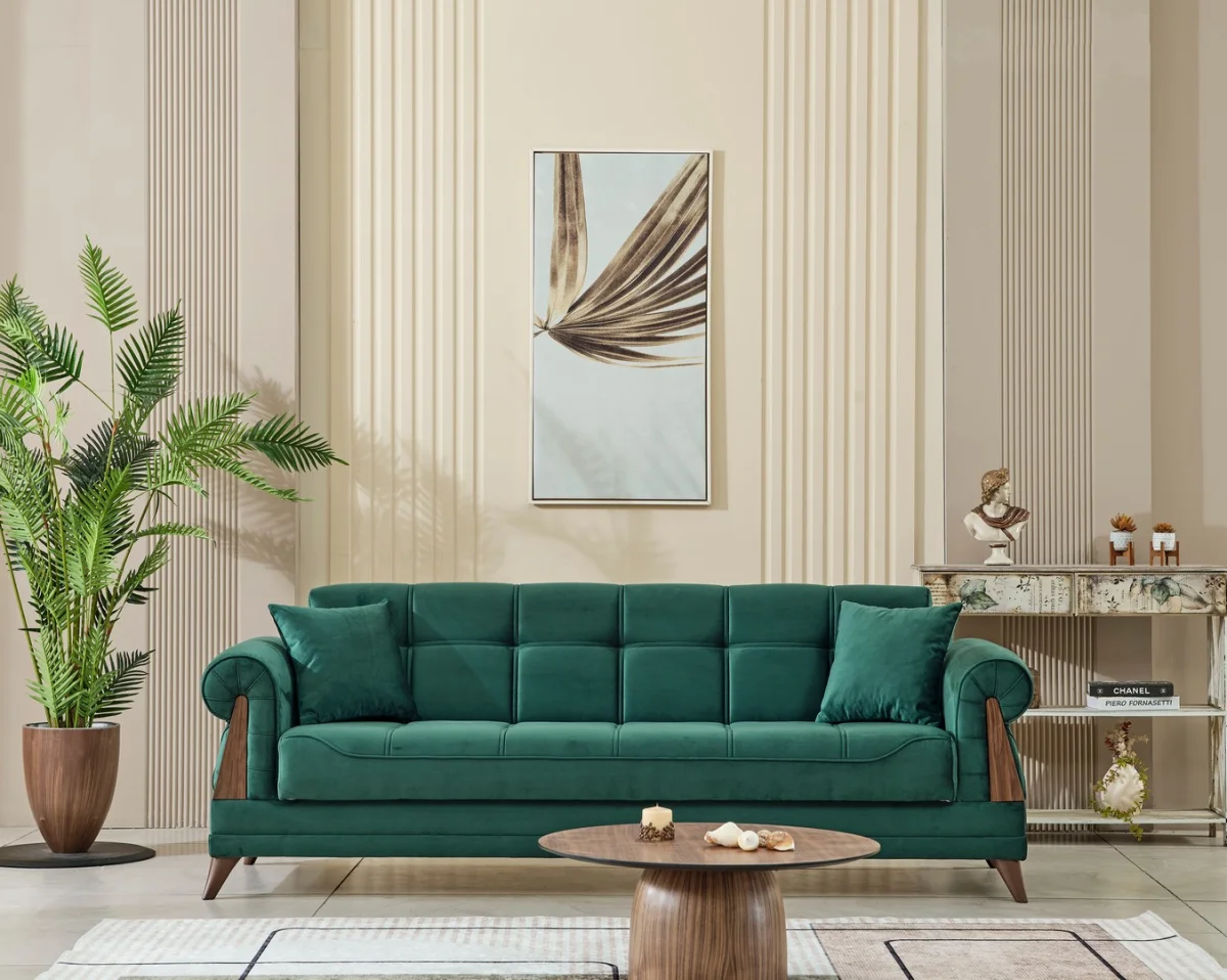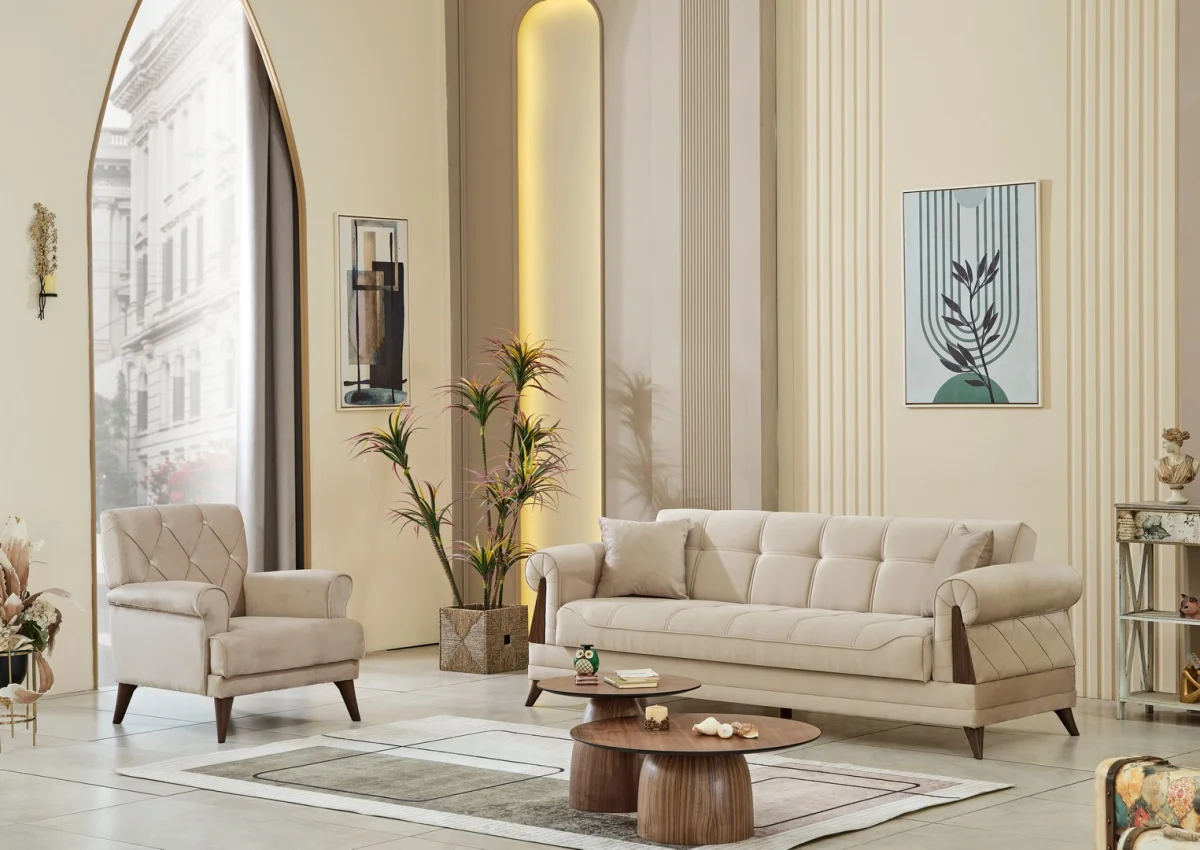 Zambak Koltuk Takımı, üçlü koltuk ve iki adet tekli koltuktan oluşan set halinde sunulur. Bu esnek kompozisyon sayesinde farklı mekan düzenlemelerine rahatlıkla adapte olur. Renginin doğal ve huzur verici etkisi, hem klasik hem de modern dekorasyon anlayışları ile mükemmel uyum sağlar. Metal aksesuarlı yan sehpalar ve dekoratif bitkiler ile kombine edildiğinde, yaşam alanınızda büyüleyici bir atmosfer yaratır. Yüksek kaliteli ayak yapısı sayesinde zemin koruyucu özelliği de bulunur.