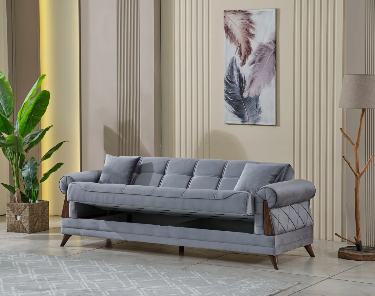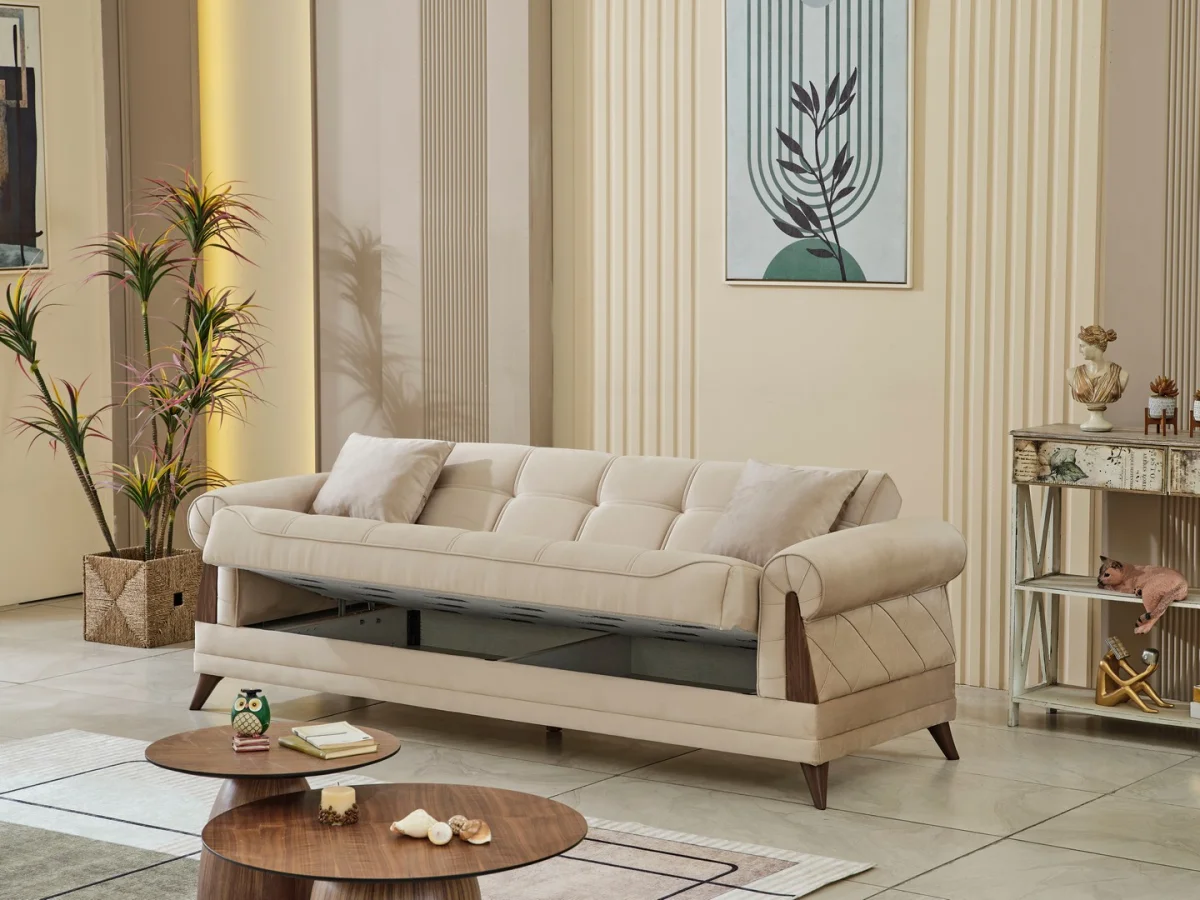 Bu özel koltuk takımının en dikkat çekici özelliklerinden biri, oturma kısmının altında bulunan geniş saklama alanıdır. Bu pratik özellik sayesinde ev tekstili ürünleri, kitaplar, dergiler ve diğer günlük eşyalarınızı düzenli bir şekilde saklayabilirsiniz. Modern yaşamın getirdiği alan optimizasyonu ihtiyacını karşılayan bu akıllı tasarım, özellikle kompakt yaşam alanları için idealdir. Saklama bölümü kolay açılır kapanır mekanizması ile kullanım kolaylığı sağlar.